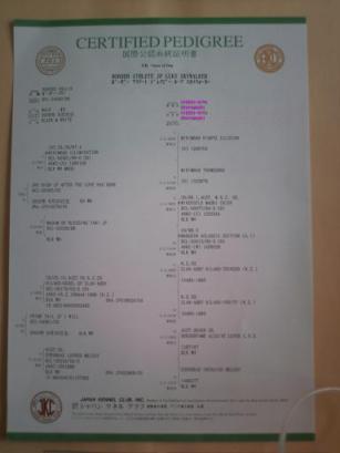 ルークの血統証です。人間の戸籍のようなもので、国際公認血統証明証といいます。ルークの正式犬名は、BORDER ATHLETE JP LUKE SKYWALKER(ボーダーアスリートジェイピー ルーク スカイウォーカー)です。なんとも、舌を咬みそうな名前です生まれる前から、名前を決めていたので、ルーク★スカイウォーカーとして頂きました。ルークの父・母。またそれぞれの祖父祖母。またそれぞれの曾祖父、曾祖母。と全部載っています。今後の繁殖計画の参考になります。(極近親繁殖に注意)遺伝性疾患の有無の確認も出来るようになります。(股関節形成不全症(HD) 発生リスクの高い犬種にボーダーコリーがあげられています。)遺伝性70%後天性30%人間の勝手で、危険リスクのある犬を繁殖する事、また、それを許す事(確認なしで、飼う・繁殖する事)はあってはならない事です。まず、犬を飼う前に勉強が、必要ですね。なにより、犬自身が、つらい一生になるだろうからです。疾患の発症していない家系 (ライン)を選び飼うなり、繁殖していく事が、最も重要です。■股関節形成不全症(HD)とは 腰と左右の後肢をつなぐ股関節が緩むことによって関節炎が発症し、痛みが出たり、 腰を振るような症状が見られ、重度になると歩いたり走ったりすることが できなくなることもあります。 リフォームの時にこだわった桜の木のフローリングも、絨毯で隠れ、又その上に、ラグを敷き、その上に、綿のマットを敷いています。190×190を3枚。絨毯は、自分でカット出来る安物。ラグ・マットも激安しまむらで、¥1980を9枚、購入し洗濯は3日おきです。トイレシーツの下にも、マットしいています。これは、毎日洗濯、取り替えです。もちろん、ゲージの中もです。失敗はしつくしていますし、そろそろ、絨毯をかえましょうかね~。安物でアイボリーがいいかも。タイル式の絨毯は、結局咬まれるし。裏のゴムは、嘔吐されます。そして、掃除は私。犬を室内で、飼うってこんなに大変とは、思いませんでした。フローリングで飼えるのなら、まだ、楽そうですが・・・。外飼いも楽だろうな~。なんで、こんなめんどくさい犬になったのでしょうか?このめんどくさい犬が、可愛くて可愛くて毎日チューして、抱いて寝ています。最初は、しっぽ振るイコール嬉しいとしか、わからなかった感情の読みが、人間らしい時が、あります。迷う。戸惑う。すねる。ごまかす。驚く。吃逆。寝屁。大分わかるようになりました。飼う前は、意思の疎通が出来るか?まじで心配していましたので・・・犬語の翻訳機。バウリンガルも購入していたほどです。(今度、遊びで使ってみましょう。もう、わかるもんね♪)今、食事を変えています。ニュートロ ナチュラルチョイスラム&ライス パピー 【全犬種の幼犬用】でしたが、ドッグフード 幼犬 母犬用◆アボ・パピー 13.5kg に移行中です。3日かけて、配分を増やしていきます。1日3回~1日2回。お湯でふやかすのも、終わりです。又、水分量も、しばらく調整しないと、下痢されると、大変です。(かたづけも…)こんな調子で、ルークは、家族になってきています。ルークを通して広がる世界もあります。又、それも楽しみなんだよな~♪