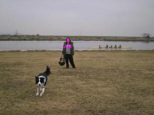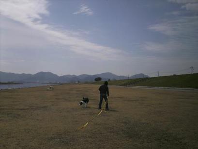 道路(危険と思われる場所)の方へ行きそうな時、「おいで!」の1声で、呼び戻せれたら…このテーマは犬を飼っていらっしゃる方からの、しつけ要請項目人気ナンバー1 です。「おいで」と呼び戻しの練習です。指導内容も、興味深かったのですが、1番は、先生ご自慢の散歩&トレーニング場 です。穴場すぎて、説明されても、場所が、特定できなかったので、お願いして、誘導案内&しつけ教室を出張という形で、お願いしました。河川敷きの中でも、ここが1番。近い♪夏はちょっと遠いですが、高梁川(県北)に穴場があるらしい…誰も知らない。芝の状態が良く、ふかふか。 安い砂まじりの芝ではありません。 管理者がいるので、掃除されて綺麗。 使用料無料、もちろん駐車場も無料。 景観抜群です。広い。50メートル間隔でベンチ設置されています。 影がないので、日中の長時間はきつい。 水はけが悪く、雨翌日はつらい←乾燥時ふかふかなのは、そのためですね。。。金光訓練士とボーダーコリールークです。【お手本】用意したのは、10メートルのロングリードです。リードを離し、流して、ルークを自由に歩かせます。注意点…ロングリードもったままはNG。 やたら名前を呼ばない。行って欲しくない範囲を決め、(今日は、土手の上側)行きそうになると、10メートルどこかで、リードをつかむ。もしくわ踏む。人間と歩くと楽しいと思えるように、ミニかけっこ。離れると、「ルークおいで」。。1言1動作 にする。来る時に人間反対側に下がる←大事くると、「おりこう」と声かけ、なでる。身体を触る←のちに首輪取りやすくさせる為そして、鼻先位置でご褒美(先生の用意のささみ)私と、ルーク【実践】気持ち良く、戻ります。完璧です♪場所と、条件が良すぎて、好調です。実際は、目新しい誘惑の連続で、呼び戻せなくなるそうです。呼び戻しできなくなるのは、人間が、ぼーっと立っているから。。。とか。反対に下がるのが大事なのは、より、興味を引く行動だそうで。。。いかに、目新しい誘惑にも勝てるほど、飼い主の魅了をしめせれるか?というのが、永遠のテーマだそうで。奥深く、難しい項目です。何度も呼び戻すと、犬「又呼んでいるわ、行って誉められるのも、あきたし」と興味ある方へいく。又、「なんで、もどってこないの?」と怒られるから戻りたくないと思い、聞かないふりをするなど、悪循環になるそうです。呼び戻す事になれさせないため、1言1動作 が重要。とか・・・それにしても、1言1動作、良く出てきます。私の中で、忠実な犬を飼っているイメージも、飼い主は、寡黙な方が多いように思えます。アルプスの少女ハイジのおじいさん。(ヨーゼフ)忠犬ハチからでしょうか?名犬ルークの為に、口数を減らしましょう。でも、ついつい、名前連発。話かけてしまうのよね。誰もいない時でも、テレビに、「なんで?」と声に出して突っ込んでいたのは、私だけでしょうか?元来、女はお喋り・話すことで、ストレス発散できるし。今は、文明の力、PCのブログで、発散。これからは、声にするのは、控えて、PCに打ち込むべし…!(^_^)vこれに限りますねすでにルークは爆睡中です。よほど、疲れたのでしょう?じっくりPCに向えます。