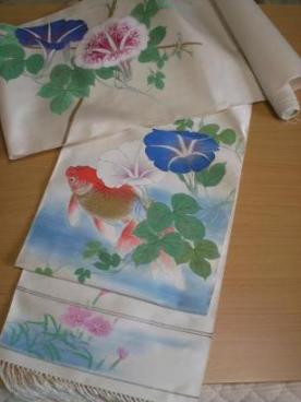 夏の準備に夏帯を自力で、お仕立てしました。金魚 と 朝顔 と コスモス の花と、大胆でしょう?手描きされている帯の 正絹反物をお仕立てしました。完成前作り方は夏は、芯なしなので、超簡単です。かがり縫いと、ちどり縫いの2つ。手のほうは、5ミリと キセ を深くしました。たれは、3つおりすると、もたつくので、2つ折りの、ちどり縫いです。縁あって、帯の金魚に、お嫁さん(ルアーの金魚根付)が来ました。→ MuRaSaki さんから 嫁いできました。MuRaSaki さん、有難う~(*^_^*)この金魚カップルの出番はいつ?完成後くっくりと夏柄ですが、夏は絽?羅?なのでは・・・?単仕様の帯でしょうか?ということは、6月?と9月?でも、金魚は7,8月でしょう?あーーーーもう! 夏はわかりません!もっとわからないのが、下着なんです。あ・・・帯揚げの変え時も・・・^^;着物初心者には、辛ーい季節がやってきます。でも、なるべく着物を着続けて、覚えていきますので、どうか、夏の着物姿の写真には、リアルタイムに素材明記をまた、涼しく着れるコツ・アイディアを教えて下さい。