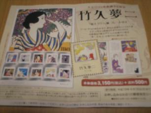 竹久夢二ファン必見★郵便局へ行った時、待ち時間つぶしに、ふるさと小包の申込みパンフレットをみていると、着物姿の絵があり取り出すと、竹久夢二の記念切手の申込用紙でした。写真夢二切手大正ロマンを象徴する画家 竹久夢二アールデコの感化を受け、独自の表現をこころみた夢二。大正13年から昭和3年まで刊行された高級雑誌『婦人グラフ』の表紙や口絵を「夢二式美人」が華やかに飾りました。記念切手¥80が10枚と、専用のフレーム付で、¥3150と送料¥500とありました。2週間で到着です。楽しみぃ~。申込はお近くの郵便局窓口へ受付期間。平成19年4月16日(月)まで。フレーム付記念切手。バレンタインデーのお返しに、父が娘さんに、キティーちゃんのフレーム付切手をプレゼントし、喜ばれたという話も、ききました。3月のは、キティーちゃんがあったのでしょうね♪時々、チェックし、和ものや、ボーダーコリー(犬)を探してみようと思いました。マニアには、たまりませんね♪マニアではありませんが、何かの時に普通の切手より、四季の花の切手を貼って友人にお便りなんで、センスあり、喜ばれるのでは・・・?詳細は、郵政サービス社 スタマガネット へどうぞ!フレームはありませんが、記念切手も、色々ありました。ふるさと切手。岐阜版「淡墨桜」ぺーン群馬版「うさぎとかめ」ゆうぺーン東京版「東京の四季の花・静岡版「河津桜」2種連刷昨年は、着物に興味を持ってはじめての桜見で、気合をいれ着物で、岐阜の淡墨桜(宇野千代桜)をみにいき、現地で、記念切手を購入しました。おなじ切手がここで売られていますわ~♪発見、複雑な気持ちです。夢二チックの着物作家物 特選 訪問着 07328野球10 ↓ リサイクル着物の天陽