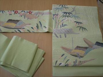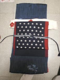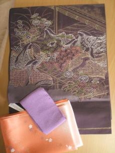 前回のブログ記載 のお店で、購入した、品をお披露目させて頂きます。セール心得5…予算以上¥もっていくな!を実践。予算は1万円握りしめて…行きました。お店が用意してくれている大袋(買い物かご)にいい!と思うと値段を見て、即入れます。レジに並ぶ前に、詳しく吟味です。あきらめ品(帯反物¥2000)を1つ、戻しました。同じ吟味中仲間が沢山います。ちょっとした、お披露目会を開催しあいっこ!えっ?それ、どこにありました?なんて商品も数多くあり、小物・帯揚げ、帯締め、あつらえ草履は、色違いで商品数多かったのですが、だいたいが、1点もの(店の中ではヨ)数人でグループ買いしている様子でした。他人のかごも気になる私。★もちろん初対面ですわ。おばちゃん達は、すごい!です。上手いわ~再度、店内1周(他人のあきらめ品を狙うため)し、レジ前に並びました。写真紫帯1化繊・姫様帯・¥3150→この日1番の高額商品です。器械刺繍模様の様です。顔の中にも、刺繍があるのですが、写真では顔なしに見えますね!この紫の姫様、と竹柄の着物で、 「かぐや姫」コーデ思案中。 秋に登場します。紫のちりめん無地半襟¥100正絹新品帯揚げのオレンジ¥1300写真夏の絽の帯2夏用(7月)やったー♪はじめての 絽の帯です。 横に線が入っています。¥1050夏用の草履?黄緑。台がレース編み模様で涼しそうです。¥105セール心得2で、…ためし履き出来る様に、タビックスはくべし。を実践し、サイズ即確認できました。かんざし、プラスチックで丸の中に、桐模様が入っています。¥315写真刺繍羽織加工用3羽織仮絵羽…¥410でした。右前袂しみ有り。加工用です。刺繍が綺麗でしょう?1g1円だったかな。レジ前のはかりで、計算してくれます。着物の小物4美保姿…¥210 このタイプは初めてです。教材枕にも、色々あるのですね…♪ポイント刺繍入りの新品足袋…¥840プラ衿芯…¥10着物ハンガー1本¥210を2つ…¥420紅葉柄の帯板¥100シャーリング伊達しめ…¥210 初シャーリング使ってみますわぁ!桜のガーゼハンカチは、粗品です。合計¥8320 です。ということは、あの気になる帯(\8400)より、安く、これだけ購入出来ました。予算が限られていますので、又の機会に…しときますわぁ…でも、十分楽しめ、得できましたので、気になる帯が、気にならなくなりました。