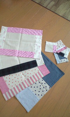 今度の土曜日に私の従姉妹が結婚します。2人兄妹で下に弟妹がいなかった私はその7つ年下の従姉妹が実の妹のように可愛くってでも母方の従姉妹なので千葉に住んでいて最近は3年前に会ったっきり。その前は私たちが結婚した2000年に挨拶に東京のほうに行った時にあったっけ。小さい時は母の里帰りについていってたので年に一回ぐらいは会えてたのだけれど。。。で、その従姉妹がとうとう結婚すると!(2人姉妹の姉を差し置いて妹が先に結婚しちゃうんだけども)何かお祝いしてあげたい!というわけで置き場所にも困らないモノ作ってみました。ランチマットとコースターのセットです。キレイで明るい色が好きな従姉妹にはピンクと赤で2枚組、男性用はよく布合わせが分からなかったんですが一応グリーンとブルー系で2枚組。計4色作ってみました。それをこんな風に丸めてMOCOのステッチ糸で結んでソレをさらに英字プリントの包装紙でラッピング~ポイントにレースペーパーつけてスウェードタッチのこげ茶のテープで三角結び。目指したのは雑貨屋さん風ラッピング。になったかなってないかはおいといて~(>_