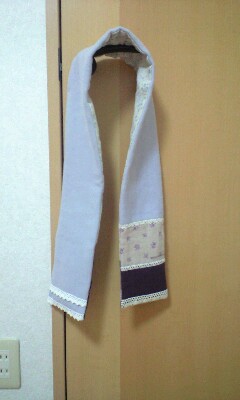 一昨日の雪が嘘みたいに朝から青空です。今日で2月も終わりかと思うとなんだか寂しいなぁ。つか来月も半ばからまた春休みだよ。。。従姉妹からブツ受取ましたメール届きました。喜んでもらえたようで何よりです\(^o^)/さてチクチク縫い縫いして写真はとってあったけど全然ブログ乗っけてないモノがたくさんあったので(見たくなくても見て~!!!ってカンジか?)今日はとりあえずマフラーから。これは自分用に作ったマフラー。細長い藤色のフリース端切れがあったのでそれにリネンやWガーゼを縫い合わせてみました。こっちはブルーグレイのきれいな花柄をメインにした側。裾に紺のリネンとWガーゼのBW、それに頂き物のタグをアクセントに春先でも付けられるようにブルーをメインなカンジで。もう一方のフリース面はフリースの藤色に合わせてパープルのリネンに同じくパープルの小花柄のWガーゼ。こちら側は「大人可愛い」を目指したので目一杯レースで飾り立ててみました。さり気に「happy*happy」のはんこもペタリ。で出来上がったのは2月の上旬ぐらいだったんですが幼稚園から帰ってきた小熊に着けたとこを見せてたら「・・・・・・・・・ぼくのは?」と真顔で言われたので慌ててその2日後ぐらいに作ったのがこのキッズマフラー。(でもほら行き当たりばったりで作ってるからちょっと長かったのよね。。。)(で自分用のは短めだったのよね。。。)2本あるのはどうせだからと姪っ子の分も作ったからで。ピンクや水色のドットにこげ茶色の可愛いコールテンの生地をメインにキノコ柄のが小熊用。イニシャルの「M」のテープはさんでみました。ピンクの小花柄が姪っ子用。女の子だし切替部にレースを飾って。裏は茶色のフリースに小熊には車柄のテープ、姪っ子用には幅広めのレース。ここにもう一方を挟み込んでクロスさせて使います。小熊のは名前を刺繍したテープと幼稚園で上着掛けに引っ掛けられるようにひもをつけたのでリバーシブルにはなりませんが姪っ子用はリバーシブルにも使えるようにアクセントにピンクの大きな花のボタンつけてみました。ちなみに小熊も姪っ子もとても喜んでくれたみたいで幼稚園や小学校にしていってくれてます。(最近は暖かいからつけてないけど。)以上長々とマフラー紹介でした~。