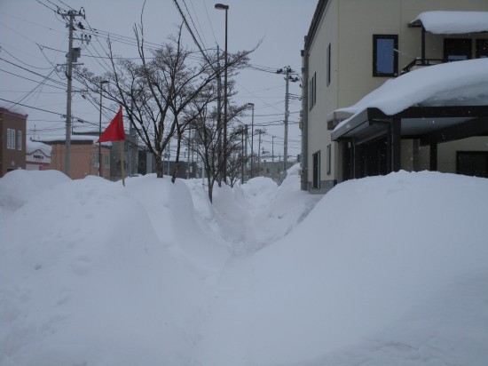 おはようござます。昨夜の天気予報で積雪が1センチから4センチとあったので今朝は積っていないと思って出かけたが積雪は少なかったが除雪の雪が駐車場の入り口にありましたね。入り口の所は除雪え寄せていてそこから落ちらのがあったが。入り口が狭くされてそこに寄せた雪がある40センチくらいだが入り口が狭くなっているこれは片付けないといけない。最初雪ベラで行なったがダメですね、雪が固まり細かい雪ですね。仕方がないのでママさんダンプを出して片付けようとしたが、塊は強いですね。何度も行なってようやくこれでいいかなと思うくらい雪を片付けられましたね。後は車の周りと歩道に積った雪を片付けて囚虜です、多分5時頃と思ってエンジンをかけたら調度でした朝の運動ですね。天気予報が貼りましたが今日は曇のち雨となっている気温も3度と高めです。今日は水曜日いつもの吹矢の練習日ですね。集中力を高めて練習をして来ますね。6ラウンド行なうとかなり疲れが出ますね。もっと練習をしないといけないが家の練習をサボっていますね、暖かくなったら家での練習も行いますね。でも家では8メートルより取れないので的に向かう姿勢を確認をするようにしています。春になったら4段にチャレンジですね。取りあえず目標170点以上です。昨日の歩道を取りました、128センチの積雪の歩道ですね。今日も元気に動ける事に感謝をして行動します、帰ってからはいつもの様にマッタリと過ごします。