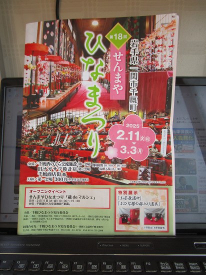 お早うございます。昨夜6時頃からかなり雪が積りだしましたがそれを片付けてから眠りに就いたが今朝はその後に積った雪を片付けてから駐車場に行きましたね。お隣さんが綺麗に片付けていてくれましたありがたいですね。私はその後に積った雪を片付けて家に帰ってきたがそれでも40分くらいかかっています。良い運動ですね。しかし昨日2時で弘前が160センチを観測した観測史上最新深だそうです。青い森は149センチを観測しています困った事です。千厩のひな祭りのチラシを写してアップですね。千厩高校生徒の琴の演奏が下ありました。パッチワークの作品が一杯有りましたが人がいて撮すのが少し大変でしたね。町の中でおひな様を飾って色々と見ることが出来る様でした。今日は月曜日ですね、いつもの様に吹矢の練習をして来ます、先週の水曜日の練習では170点を割り込みましたので、今日はしっかりと練習をして来ます。帰ったらいつもの様にマッタリと過ごします。しかし今日の天気予報は雲で気温は2度となっています雪が峠を越えたのかな?そうであったら今朝の雪片付けで今冬の片付けが終わって欲しいと祈っています。