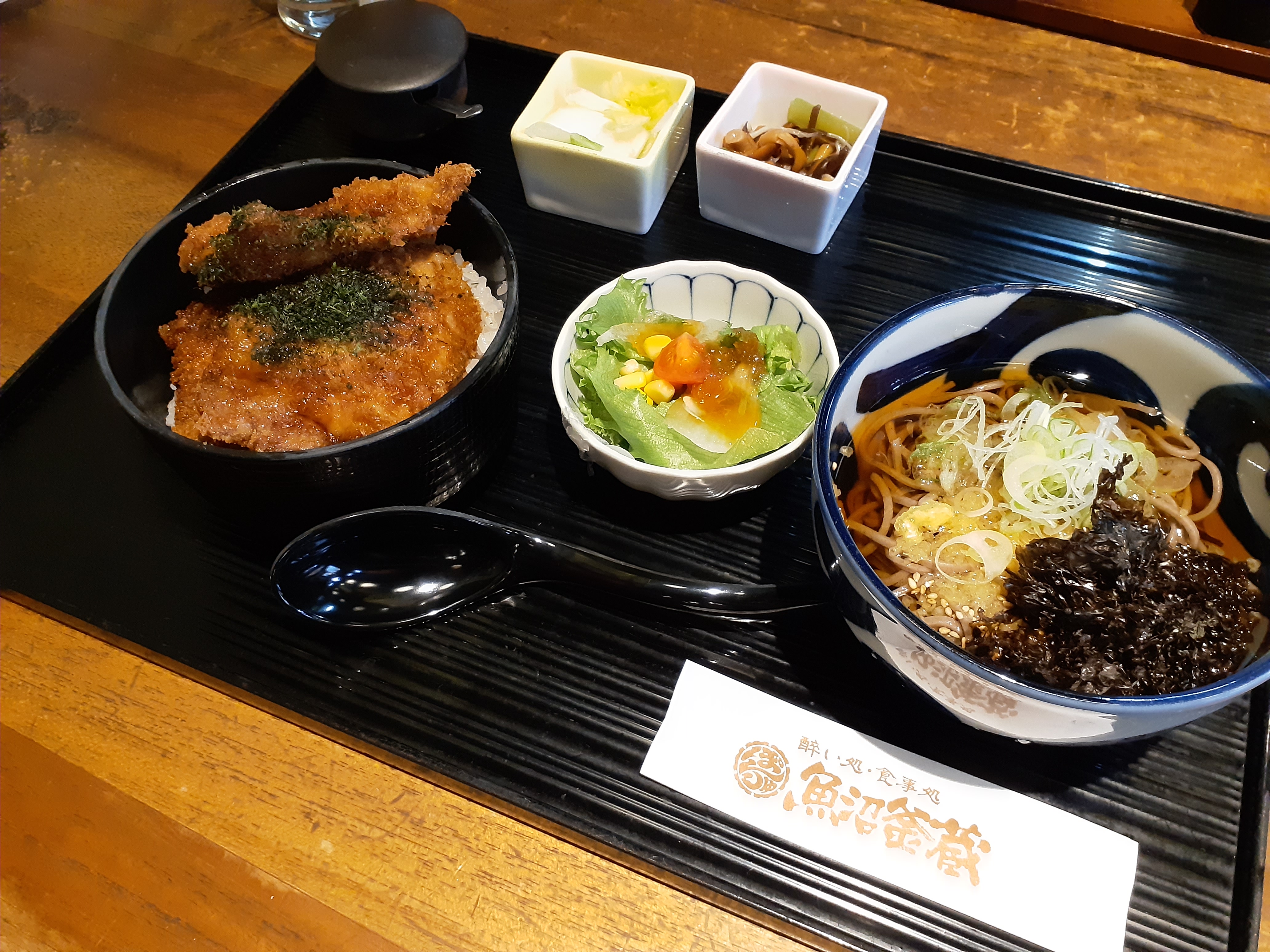 やっと新潟っぽいタレかつ丼喰らう主人。私はお寿司とそばセット。