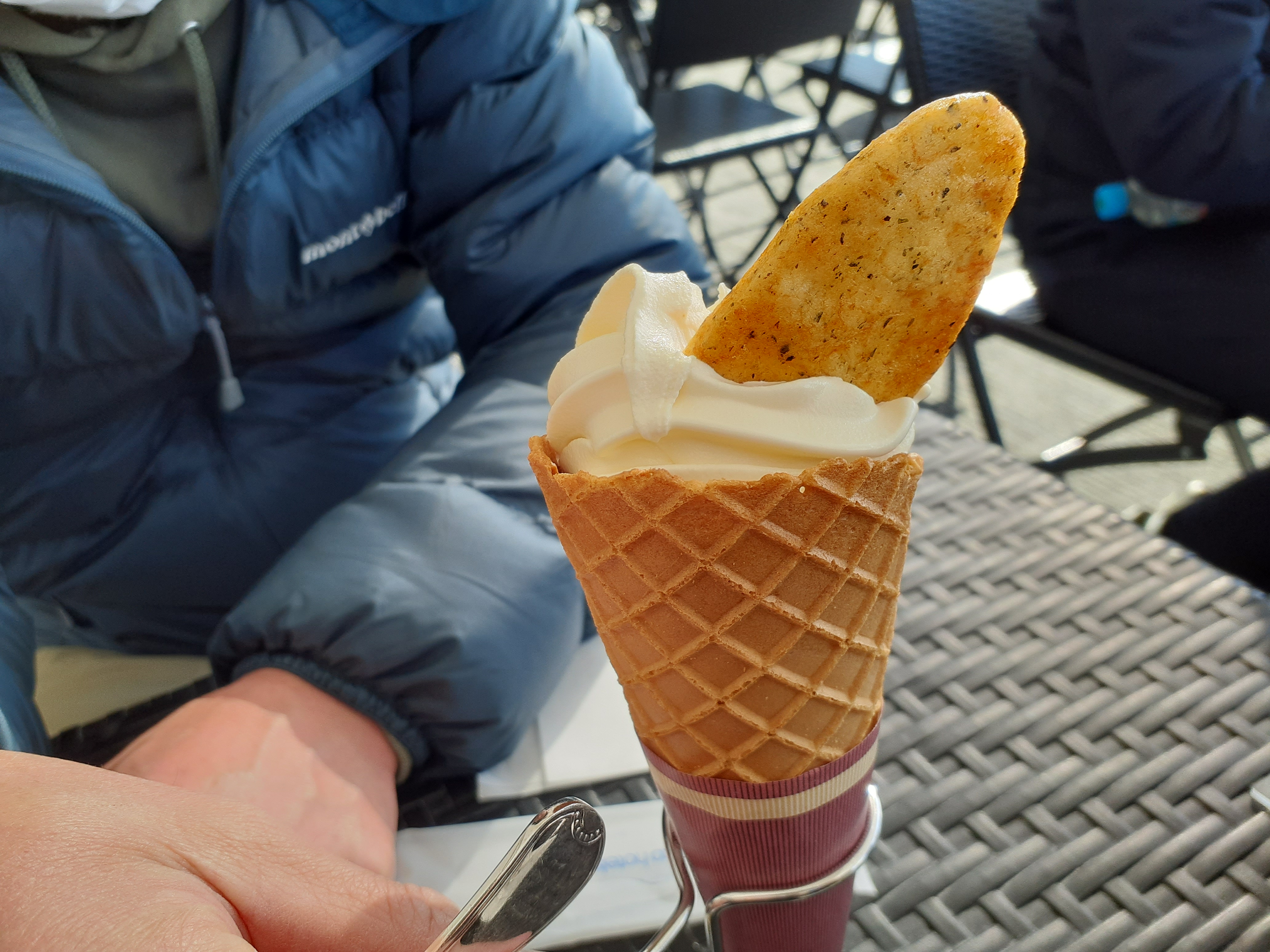 ソフトクリーム頼んだら、ばかうけ付いてた。青のりにしたんだけど甘じょっぱさが良い感じ。