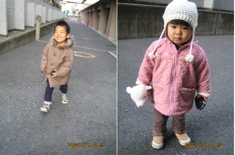 昨夜も、もちろんお布団でグッスリな2人☆パパを12時頃にいったん起こし、一緒にビデオ鑑賞ねv( ̄∇ ̄)v今ね、「鋼の錬金術師」ってアニメにハマってる私たちwパパが先に漫画で読んでたんだけど、その後はアニメ化されたDVD鑑賞に(笑)私は観てなかったんだけどねぇ、パパが見てるの一緒に見てると結局ハマっちゃって(* ̄m ̄)プッなので毎日レンタルしてきたのを観てるってわけwそれが終わってから、同じくレンタルした「真下交渉人」のDVD鑑賞。だけど途中で眠くなって・・・・ウトウトZzz…(*´~`*)。o○ ムニャムニャ15分くらいで気付いたんだけどもう2時半だし、すぐに寝ることに。珍しく本読まないで寝ちゃったわ(笑)今朝は、子供たちもさすがにゆっくりの起床☆2人一緒に8時過ぎに寝室から出て行ったよ。私はまだお布団でまどろんで、9時前に起床☆パンと牛乳与えて、洗濯&片付け&掃除して幼稚園は午後からだし、今日はそれまでゆっくりしようとずっとゴロゴロw雪穂には早めにお昼寝もしてもらいたかったしね(゚-゚*)(。。*)ウンウン午前中に、晩御飯の下ごしらえだけしてしまって、お昼ごはんは煮込みそうめんを食べ、もう少しゴロゴロ☆雪穂が13時半には寝てくれたから、陸央にはしまじろうが来たのでそれで時間つぶしねヾ(@⌒▽⌒@)ノ14時半に早めにおやつにしたんだけど、もちろん雪穂も飛び起き(* ̄m ̄)プッさっさと食べさせてから、15時前にε=ε=ε=ヾ(´▽`*)ノ☆イッテキマース☆ヾ(*´▽`)ノ=з=з=з 着いてちょっとすると、仲良しAちゃん&ママとSちゃん&ママも来たので一緒に受付などさせてもらったよ☆^(o≧▽゚)oニパッ受付・通園バスの申し込み・靴の購入に続き、制服の購入♪それが終わったら、幼稚園の園庭で遊ばせてもらったよ~ヾ(〃^∇^)ノわぁい♪また雪穂のチャレンジャー発揮だけどねヾ(;´▽`A``アセアセ滑り台の上でぶら下がり・・・・陸央と同じように登ってたんだけど、陸央は怖いからポールにしがみついてるのに雪穂の大胆さ(笑)この2人の違い、わかるでしょ?wしばらく遊んで、もう16時も過ぎてるから帰ることに☆次は、2月にクラス分けがあるらしく、3月には入園説明会などなどが・・4月の入園式まで、いろいろとあったりしてワクワクドキドキだねヾ(@⌒▽⌒@)ノ帰りにスーパーの寄って買い物。ここで陸央が久々にお遣いしてくれたよ☆^(o≧▽゚)oニパッピーマン持ってきてって言うと、迷ったりしてたけどちゃんと探してくれてレジにお金とカゴを持っていき1人で会計終わらせて帰ってきたわ゚+.(ノ*`・Д・)ノ*.オオォォ☆゚・:*☆さすが、もうお手の物だね☆ 17時頃に帰宅して、早速制服着せてみました~( ̄▽+ ̄)キラーン大きいから、お直ししなくっちゃ!どうですか?似合うかなぁ・:*:・(*´ー`*人)。・:*:・片付けたら、すぐに鉄板を出して焼きそば作りに☆^(o≧▽゚)oニパッやっぱり焼きそばは鉄板に限る(゚-゚*)(。。*)ウンウンとっても美味しく、あっという間に食べちゃったわぁ☆そしてお風呂に入ったんだけど、最近ね2人の成長が!「せ~の!」って言うと、湯船に顔を付けれるようになりました!(*´∀`)ノノ*´∀`)ノノ*´∀`)ノノ:*:゚'★。:*:♪゚'☆パチパチ【オメデ隊】前から、石けんで顔洗ってキチンと水で流せるようにはなってたんだけど水面に顔つけるってなかなかだよね(゚-゚*)(。。*)ウンウンスイミングにちょっとでも行ってたお陰か、2人とも顔つけに抵抗なく見事に成功してくれたわv( ̄∇ ̄)v雪穂も「い~ち、に~、しゃん」って数えられるようになったしね☆上がってから、雪穂のパジャマタイムです(笑)途中からだけどwあ、三つ編みしたのを可愛いから撮っちゃったんだけど気にしないで(* ̄m ̄)プッシャツを着て、パジャマの上を着る・・・んだけど手が変なところから?!なんとか手を入れて・・・・・肩のボタンを留めたら・・・・・出来上がり☆^(o≧▽゚)oニパッ時々手伝うんだけどね(゚-゚*)(。。*)ウンウン気付くと勝手に着てくれてたりするから、楽チンだわ♪ 休憩してから、20時にお布団へ☆夕方によく遊んだから、今日ももちろんあっという間に爆睡ねZzz…(*´~`*)。o○ ムニャムニャそうそう、幼稚園に行くとき「今日はお兄ちゃんの幼稚園に行くよ」って言うと「ゆきたんも ようちえんいく~~!」って(* ̄m ̄)プッ本人、かなり行く気マンマンなんですwきっと4月に陸央とバスでバイバイしたら、一緒に行くって泣くんだろうなぁヾ(;´▽`A``アセアセそんな活発な雪穂は、来年には年少さんで幼稚園行きですから!あと1年待ってくださいね(笑)雪穂語録、最近あまり更新してないけど・・・・覚えてないくらい普通に喋ってて、この日記更新する頃にはすっかり忘れてしまってるんですわヾ(;´▽`A``アセアセ歌はどんどん上手になってて、陸央と一緒に「リュウケンドー」を歌うしとなりのトトロの歌も上手だし、もちろん陸央ともちゃんと会話してるしねぇ(゚-゚*)(。。*)ウンウン今日は、陸央が「ゆきたん、ママにあほって言ってきて」って言われるとちゃんとマ