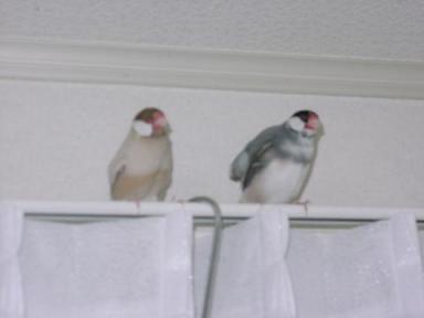 でも、白文鳥のじょうはいつも仲間はずれ・・・ちょっと歳がはなれているので二羽から攻撃をうけてます。かわそ~に