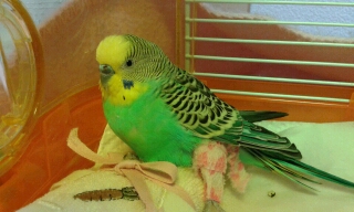 我が家のSKS47、keepが昨日大怪我を負った。仕事から帰ってきて、いつものようにkeepの餌入れを取り出し、キッチンへ行き餌の補充。こむカンのおやつも用意した。毎日同じ動作。小麦をケージから出し、体重測定。そしてカンチの体重測定...ここで事件が起きた。小麦がkeepのケージの中!しかも、keepを羽交い絞めにしている!!えっ、なんで?!keepのケージから餌入れを取り出した後、ナスカンをかけ忘れたのだ...。慌てて小麦をつかんでkeepから引き離し、ケージの中へ。驚くカンチも手に乗せケージへ。keepはケージの中で茫然。左足がダランとしている...。キャリーを用意し、手を怖がり暴れまわるkeepを捕まえ、体のチェック。幸いにも出血はなさそう。でも、左足は...折れている。とりあえず、添え木で固定しなきゃ...と思い、つまようじを短く切り、マスキングテープを2cmくらいに切った。セキセイの足に添え木を巻くのは初めてではなかったけれど、みんな手乗りだったしたぶん家族がいた。でも、まだ手乗りというほど慣れていないkeepに、一人で添え木を巻くのはやっぱり無理。かかりつけの鳥の病院に電話をしてみたけど、20:00前、やっぱり出ない。近くの鳥を診てくれる病院にも電話をしたが、やっぱり出ない。しかたないので、保温をし、体を預けられるよう、ティッシュを丸めたものを入れてあげ朝まで様子を見ることに。一緒に入れてあげた粟穂はパクパクとついばみ、完食。食欲はあるので、少し安心した。そして朝、出かける準備をして、かかりつけの鳥の病院に一応電話。やっぱりまだ出ないので、とりあえず9:00からやっている近くの病院へ。しかし...鳥を診てくれる院長のS先生は、昨夜からアメリカ!もう一人いた鳥を診る先生は先日辞めた...。なにぃ(▼▼#)一応保定して足の確認をしてくれたが、テーピングくらいしかできないと他の病院に連絡を取るように言われ、病院を紹介してもらった。その病院は家のすぐ近くだった...。でも、そこに電話をする前に、まだ診察時間になっていないけど、ダメ元でかかりつけの病院に電話をしてみた...出てくれた!事情を説明し、先生は、午後から出かけるので手術をしなければいけない状態でも、今日はできないのを了解してもらえるのであれば、診てくれるというのですぐに向かう。予約の患者さんの合間を縫って、診察&レントゲン撮影。折れてました。かかとと膝のちょうど中間あたり。手術でワイヤーを入れてまっすぐに治す方法と、ギブスでがっちり固めて治す2つの選択肢がある。内出血はしているけれど、周りの筋肉などの損傷はなさそうだけれど、今の段階では、動いていない踵から先の部分は、現状では神経がマヒしていて動かないのか、ただ痛みで動かしていないのかは解らないので、どちらの選択をしても、マヒが残る可能性はあるとのこと。30gしかない小さな体に麻酔を打つのはリスクがあるので、ギブスの固定を選択。しっかりと固定してもらいました。これまた、小さな体には大きすぎるくらいのギブス(^^;3重に巻いてあるそうです。一番表面は齧る用、その下はピンクと白の柄付でこれも齧ってしまっても大丈夫。その下の茶色のが本来のギブスなので、それが出ちゃったら要連絡。ご褒美に先生がくれた粟穂をポリポリとついばみ元気をアピールしてくれるkeepくん。良かった...。病院から戻った直後のkeep。足が治るまでの病室。お疲れさま。痛い思いさせてごめんね、早く元気になろうね。