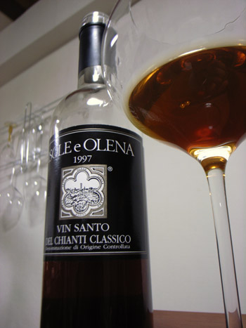 本日のワインは、ヴィンサント・デル・キアンティ・クラシコ1997年、生産者はイゾレ・エ・オレーナです。キアンティと言っても当然サンジョベーゼで造られているわけではありません。マルヴァジア・デル・キアンティとトレビアーノという白ワイン用の品種となります。前回で同ワイナリーのキアンティをレヴューしましたが、そういえばヴィンサントも開いていたな、ということで・・・。さて、感想です。黄色みがかった琥珀色、というかくすんだ猫目色。香りは煮込んだ金柑やはちみつ紅茶、オレンジや干し柿など。あと、どことなく焦がしたイメージ。ヴィンサント特有の甘草他の漢方系の香りもしっかりあります。開栓してから2~3ヶ月か経っているからか酸は強め。余韻は,決して強くはないのですが、長く長くいつまでも舌の上に在りつづけます。実はこのワイン、1年程前にオークションで手に入れたのですが、発売当時に酒屋さんから購入した同じヴィンサントと比べ、かなり透明度が低い。出品者から届いてまる半年位、瓶を立てていたのですが、変わらず。飲んだ限りではダメージは分からなかったのですが、何故なんでしょうか。