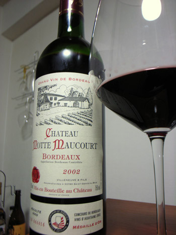 本日のワインは、シャトー・モット・モクール2002年です。りりた的には珍しくボルドー産です。実はブログにアップしていない日でも、結構ワインを飲んでたりします。ぶらぶらしてて、店頭に限定!お勧め!みたいに書いてあって思わず買ってしまったデイリータイプのワインなど(こーゆーパタンは○神百貨店が多い)。これはその内の1本。セパージュはメルロ70%、カベルネ・ソーヴィニョン30%。さて、感想です。色合いは暗めのガーネット色。香りはすももや杏、クランベリーや赤のカシス、そしてスパイス系。膨大ではないが、けっこう楽しめるレベルの果実味。タンニンは細かく、チャーミングな酸とキレイにフュージョンしながらフィニッシュへと向かいます。それなりに旨みエキスもあり、購入価格1680円位は合格だと思います。楽天ではもっと安く売ってますね(笑)。