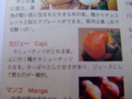 本をパラパラめくってたら、懐かしいものを発見しました。 中央に載ってる果物と言えばいいのかナッツと言えばいいのか。コスタリカのジャングル暮らし(以前ちょこっと紹介しました。→瀕死のバナナから蘇る私の遠い記憶。 )(ジャングルとよんでいいのか未だ不明) してたときに、小屋の目の前にこの木があった。「マリニョン」って呼んでた気がする。そう「カシューナッツ」の木。このカシューの実を採って、ジュースにすると美味しいと連れが言ったので、収穫して、黒砂糖を少しいれて実を潰してジュースにした。でも、甘みが少なく、大して味もなく、酸味が少しある。あまり美味しいとは思えなかった。だけど、なにもないジャングル暮らしにはこの「ジュースになる」ってところが貴重だった。本にも、「ジュースにして飲むのが一般的」って書いてあって、ちょっとビックリ。どんな風にしたら美味しくなるんだろ。ちなみに、私はほとんど飲まなかったから、余っていって、プクプク泡だって、だんだん発酵していった。わたし的には、「発酵」っていうより「腐っていってる」としか思えなかったけど、相方は「果物酒」だと言って、飲んでた。 カシューは実ひとつに一個しかナッツを付けない。(表現がちょっとおかしい?)ナッツになる部分が種だったか、実の中にも種があったか、もう忘れました。写真に戻って見てもらうと分かるように、実のおしり部分にかわいくポコっとカシューのナッツになるとこがあるでしょ?見ようによっては、プリプリしたおしりから、○○○が・・・・。おっとっと、失礼。 1コの実から1コしか採れない。そう考えると、カシューナッツってすごく貴重だよね。 わたしも、カシューを収穫するときは、ナッツになる部分を大切にとっておいて、最後に「カシューナッツ」にするのを楽しみにしてました。 この生活の最後のほうに、火をおこして、集めたカシューを炒って「カシューナッツ」にすることに。(普段の調理はガスタンクが小屋にあったのでガスを使ってました。水は生水。) これがまた大変。大体、ナッツなんて炒ったことないし、焚き火の火は調整が難しくて強すぎるし、こんな野生のマンゴーが生息するところに焚き火なんて、クソ暑いし、火に近寄りたくない。結局、こういうことは相方がやるんだけど、このカシューって実は曲者(クセモノ)。 素手でカシューを触った相方は、カシューにまけて、手の皮がみるみるうちにボロボロ剥けて可哀そうな状態に。さらに、カシューも丸焦げになり、食べれる状態ではありません。 結局、大事に集めたカシューは全滅しました。 今はきっと、あの小屋には誰も住んでなく(誰か住んでるかな?)、実が生っては誰にも収穫されず落ちていって、若木が育っていることでしょう。 みなさん、ミックスナッツの中にカシューナッツを見つけたら、大事に食べてやってくださいい。