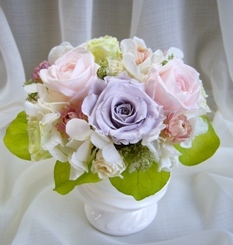 以前、ご自宅のお玄関に飾るワインローズでのオーダーメードをご注文下さいました方から、「病室に飾るアレンジメントが欲しい」と、ご依頼がありました。同居されていたご高齢のお母様が、入院されたそうです。病院はとても乾燥しているとのことで、プリザーブドを希望されました。お母様はもちろんのこと、ご看病中のご依頼主様にも安らかな気持ち になって頂けるように、やさしい色合いに仕上げました。娘様からお母様への大切な思いを感じながら、心を込めて製作いたしました。一日も早くお元気になられますように・・・。
