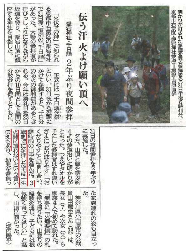 昨日の京都新聞の記事です。三歳と言えば・・・・今は七五三詣りが盛んですが・・・私の子供の頃は十三詣りが主だった様な気がします。数えで13才になったら嵐山の法輪寺にお参り行くのです。私は十三詣りには行きましたが、七五三には行ってないのです。十三詣りについてウイキペディアにはこの様に書かれています。元に戻って愛宕さんの千日詣りですが・・・京都では火を使う台所等に、このお札が貼ってある家が多いです。