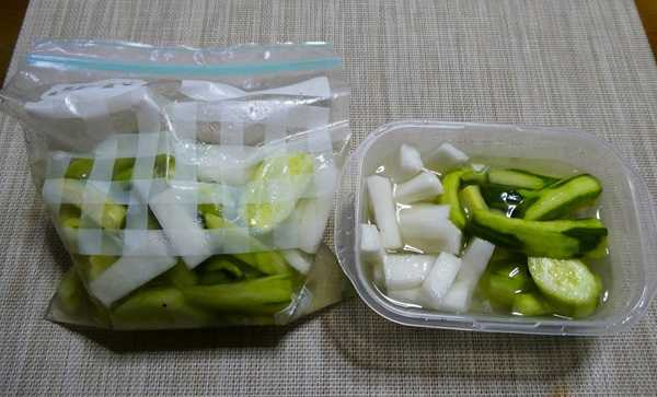 先日葉っぱの陰に隠れていたキュウリを発見したことを書きました。そのお化けキュウリに味をしめて・・・・次は意図して採らずに大きく育てて2本目のお化けキュウリを収穫したことも書きました。そんなことがあって、お化けキユウリの利用価値を認めていたのですが・・・・またもや、新たに隠れていたお化けキュウリを発見したのでした。今回はびっくりと言うより、喜びでした。計って見ると・・・・1本目が 576g 2本目が546gでしたので 3本目が一番大きかったのです。さて、今回はどうして食べるか????先日、普通の大きさのものをピクルスにして、美味しかったので今回のお化けキュウリはピクルスに決定。今回は余りに大きくて皮が硬そうなので・・・皮を剥いて・・・・・4つに切って・・・・タネを取り除きますと・・・・607g 有ったものが421g になってしまいました。これをどう調理したのか分かりませんが・・・・これだけのピクルスが出来上がりました。ピクルスにしたのが大正解!!!! 歯応えも美味しさも、実に抜群!!!食べ始めたら・・・カッパえびせんではないですが・・・止まりません。おやつの様な感じで食べるので直ぐ無くなりそうです。来年からは意図してお化けキュウリを作り、ピクルスに・・・で決定しました。