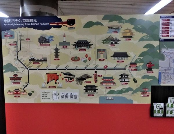 ​​​ 12/9​のブログで​七条駅に所要時間毎の立派な散策案内パンフレットが置いてある事を書きましたが、七条よりもっと観光地駅の三条駅改札口にはもっと立派な案内板と同様のパンフレットが有りました。