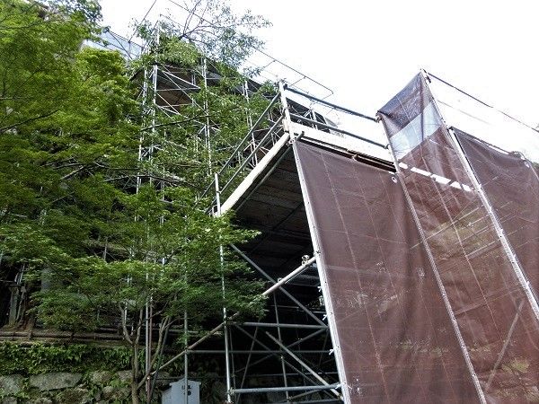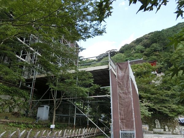 子安の塔 舞台 の眺めは前に載せましたが、今日見ると舞台の下部の工事で覆いが張られていました。