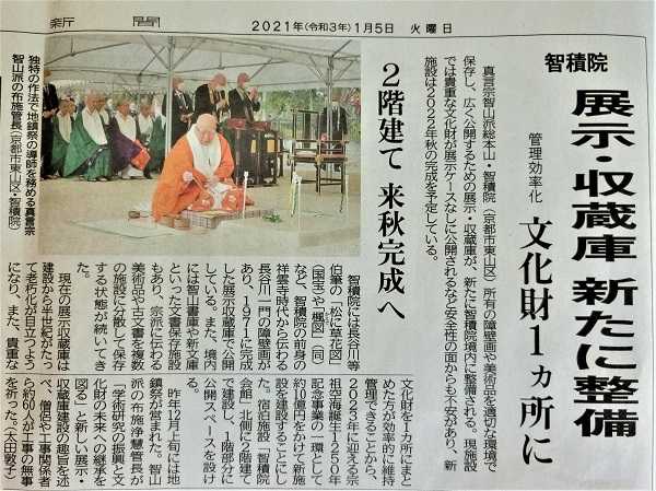 ところで、新しく建てられた智積院会館(宿坊)の前に、引き続き、新しく宝物の展示・収蔵庫が建てられる事を書いたことがありましたが、京都新聞にその事についての記事が載りました。