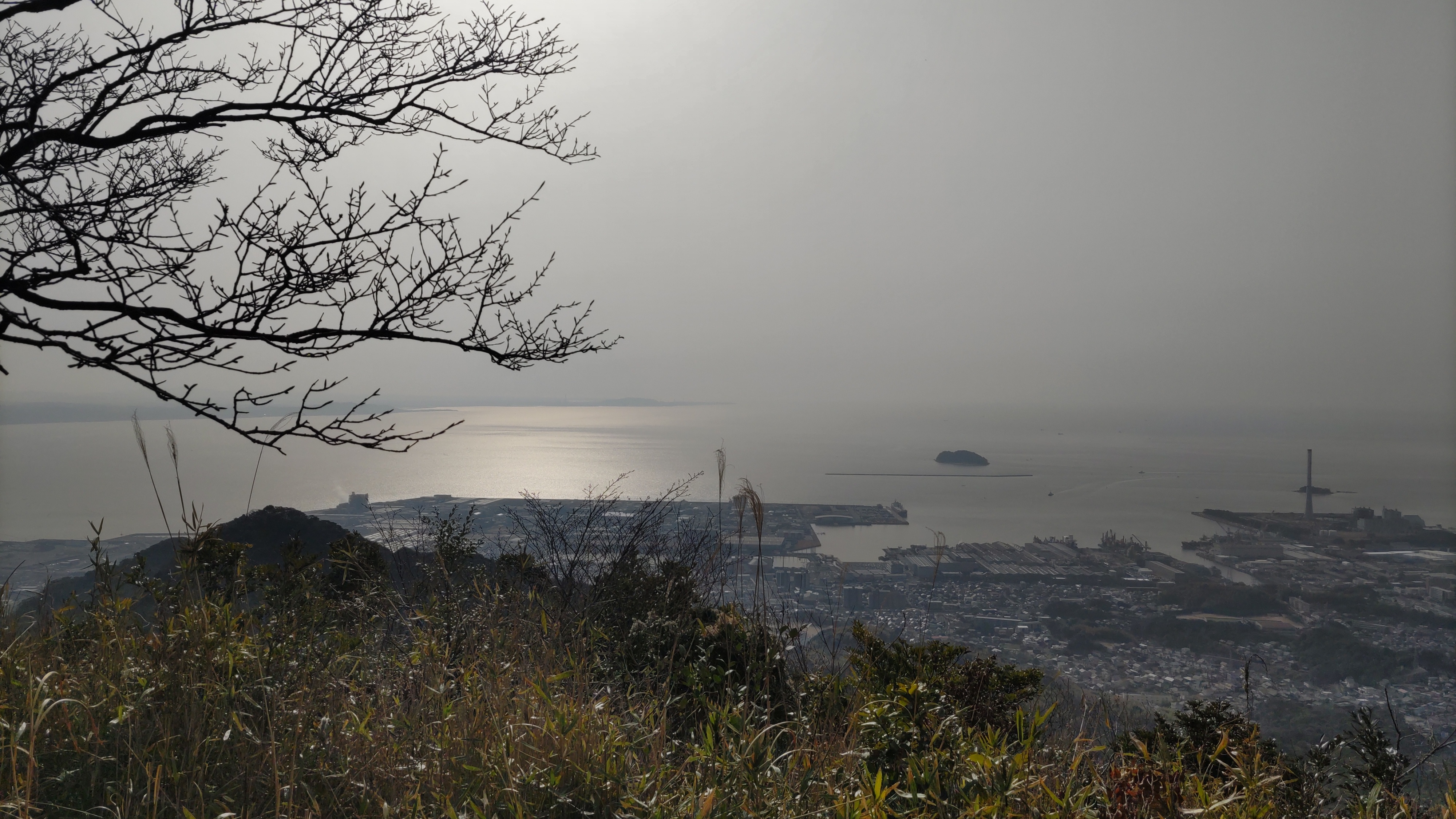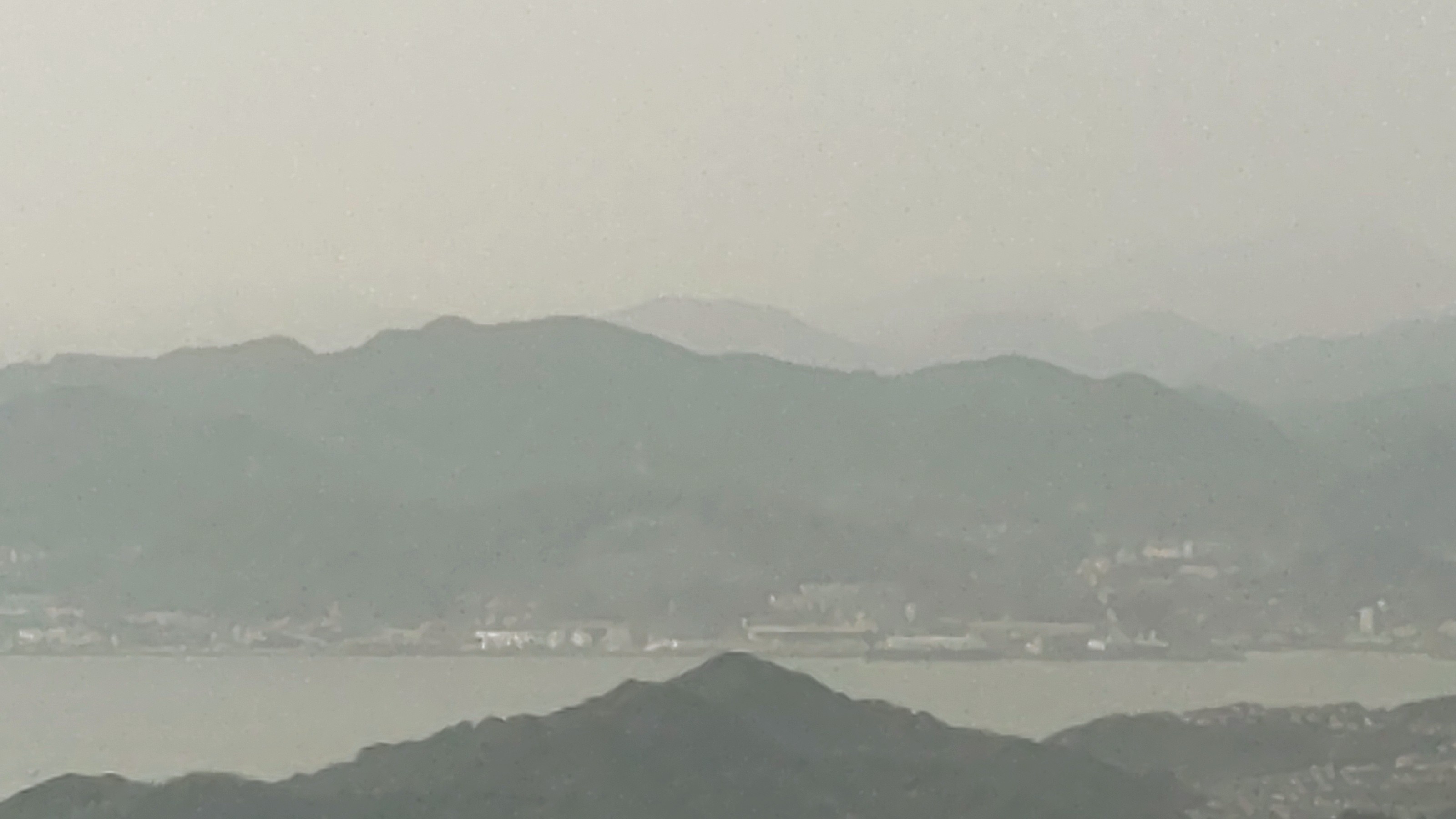 右方向に関門海峡、向こうに北九州・門司の山並みが(風師山方向はもっと右なので見えず) 見えたのですが、天気が良いのに黄砂のせいかこんな見え方でした。