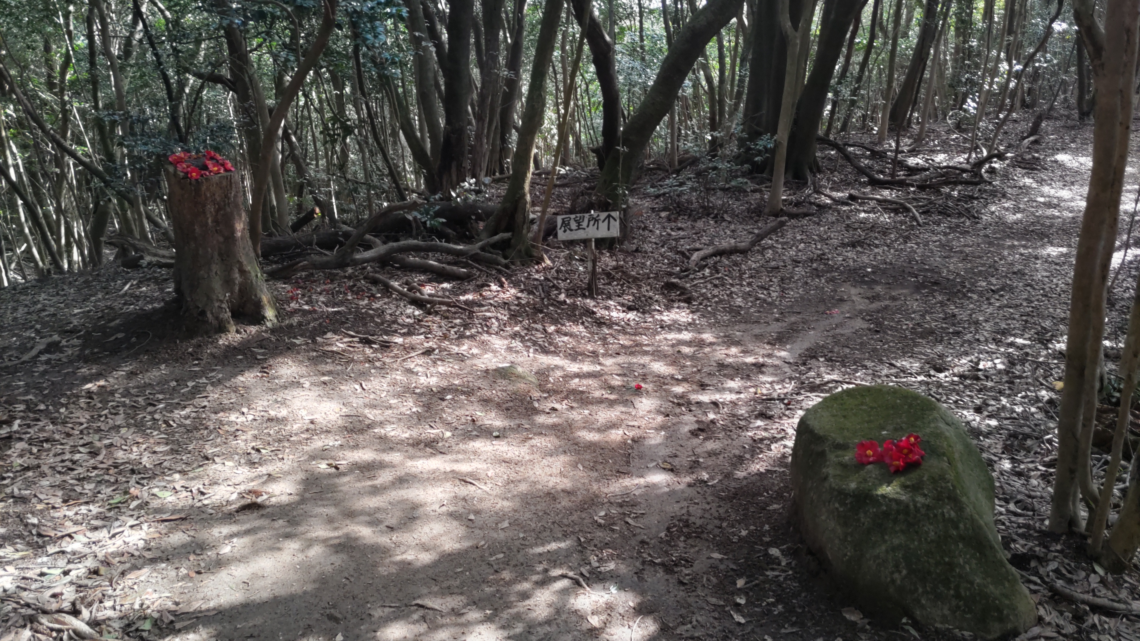 やぶ椿の木が多くて花がいっぱい落ちていて、石や切り株の上にはこんに椿の花が置いてあって他では見られない風流なモノでした。