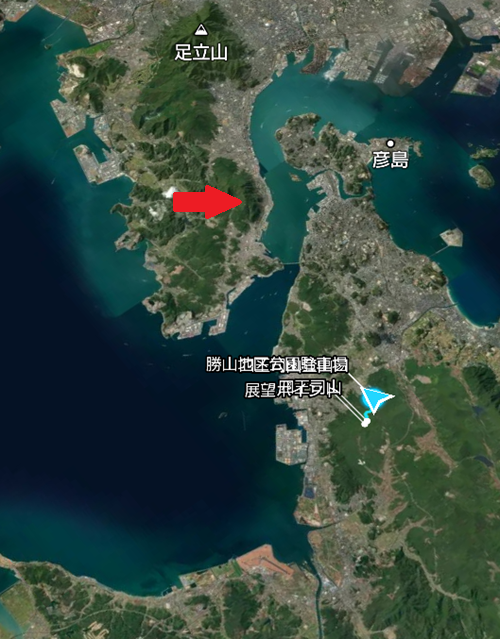 2023年5月に登って同じく関門海峡を見下ろした北九州側の 風師山 の位置です。