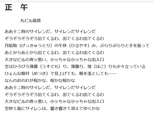 中原中也と言えば・・・高校1年の国語(甲) の時間に習って未だにおぼろ気に憶えている「 正午 」が載っていなかったのでその場でネット検索して復唱しました(笑)