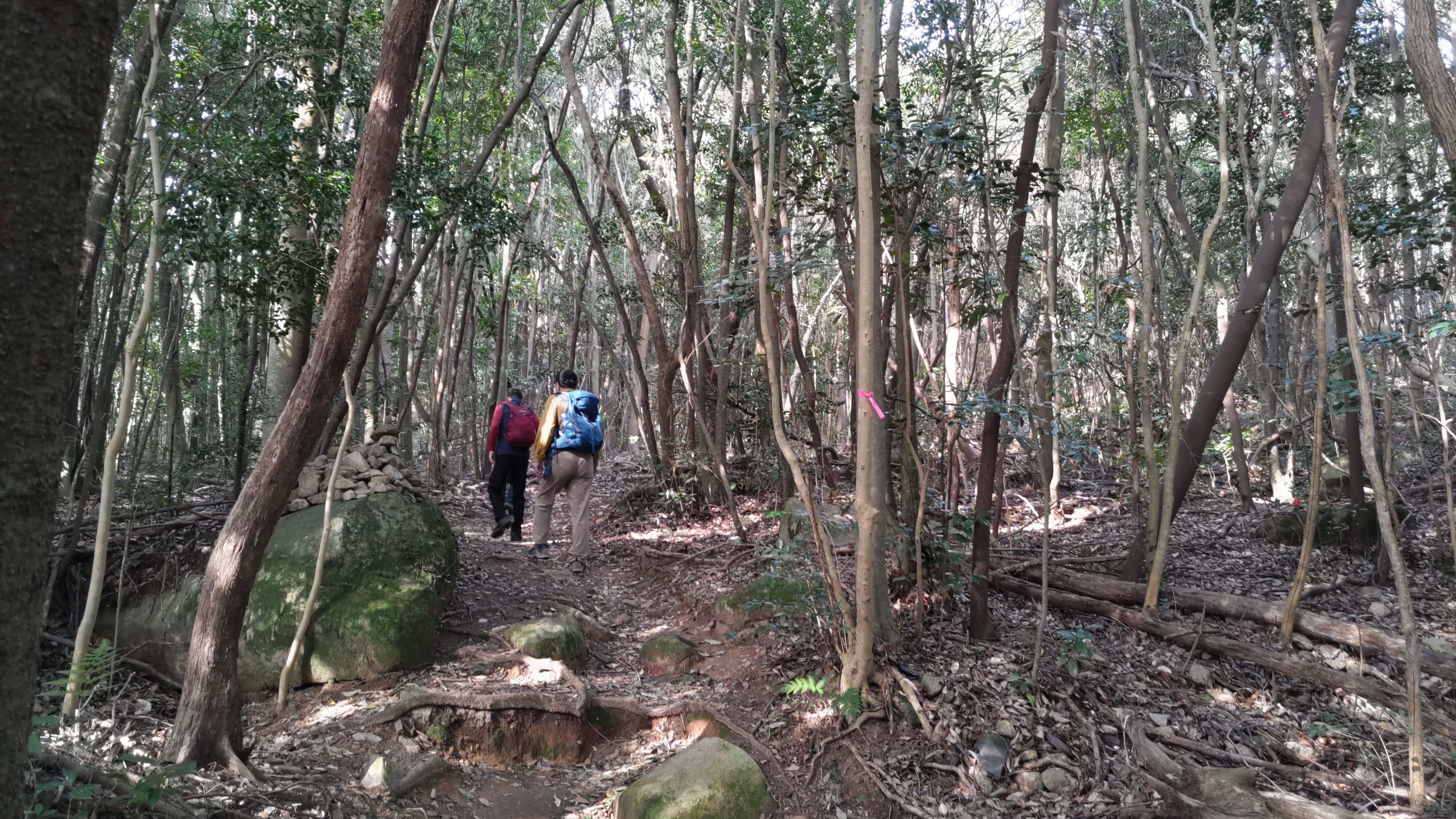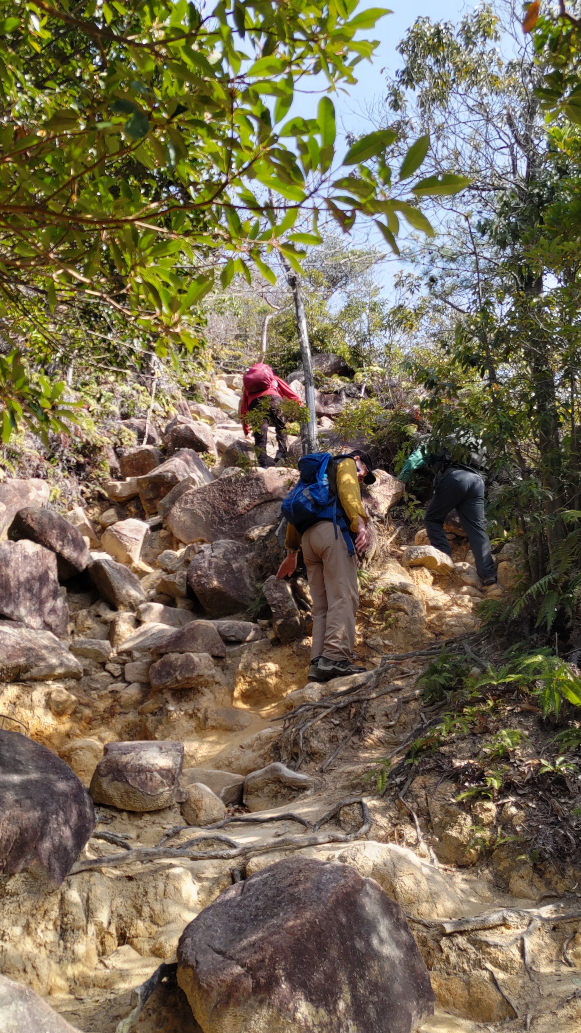 雑木林が過ぎると、こんな急こう配のルートで張られたロープが頼りの箇所が数ヶ所ありました。