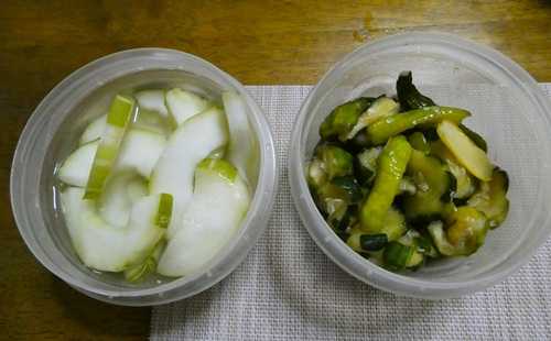 左が瓜のピクルス、右が今回のキュウリのピクルスですが、少し醤油を加えるなど調味料を少し工夫したらしいです。