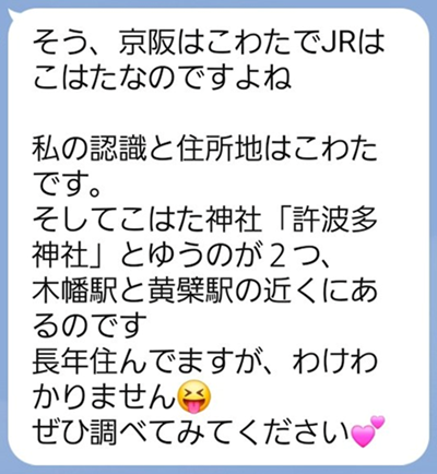 これは木幡の住民の姪に訊くのが手っ取り早いとラインで問い合わせると・・・