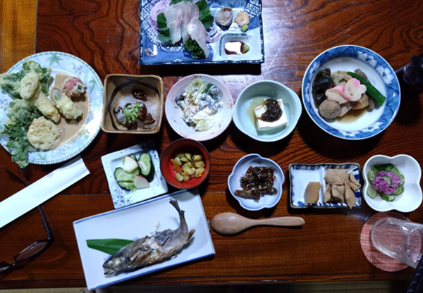 夕食もヤマメの焼いたものに、お造り、山菜の天ぷらから山菜尽くしの凄い品数の豪華料理でした。