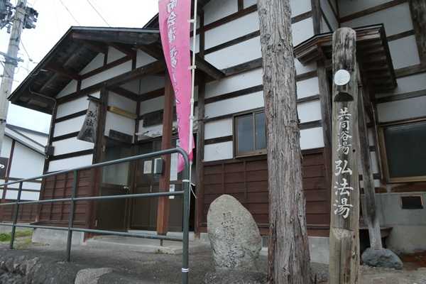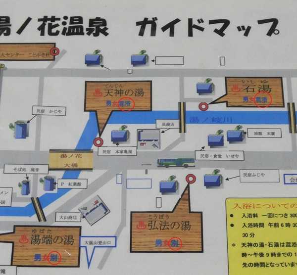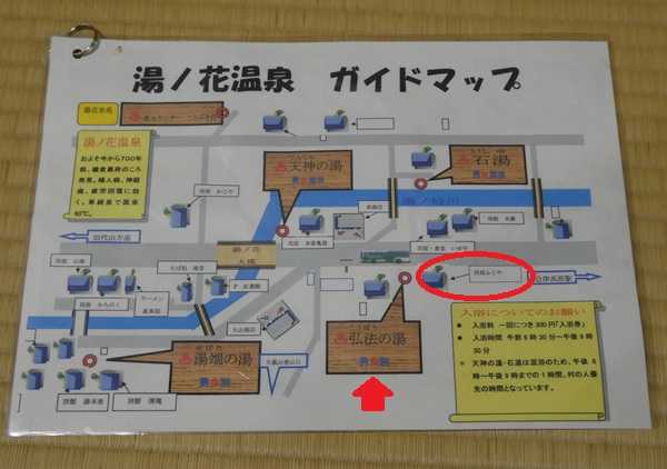 温泉は外湯で4ヶ所何処へでもどうぞと言われたのですが目と鼻の先の 弘法の湯 へ(赤矢印)