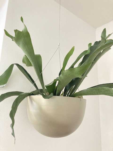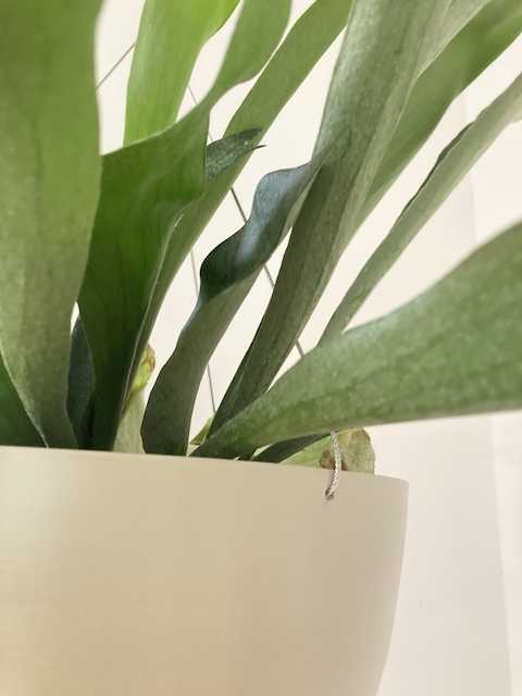 鉢カバーのワイヤーが細いので、コウモリランの葉が引き立ちます。