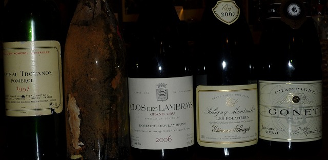 馴れないセミナーなどやって疲れたので、自分が泡を飲みたくて2次会を一階でやりました。一人一本では飲み足りない有志が8人集まって始まりました。飲んだワインはこんなワインです。泡:フィリップ・ゴネ ゼロ白:ピュリニー・モンラッシェ レ・フォラティエール 2007 エティエンヌ・ソゼ赤:クロ・デ・ランブレイ 2006 ドメーヌ・デ・ランブレイ赤:シャルム・シャンベルタン 1978 ジャブレ・ヴェルシェール赤:シャトー・トロタノワ 1997イヤーどれも素晴らしいワインでした。まあ懲りずによく飲む人ですね、私も・・・・お付き合い下さり有難う御座いました。