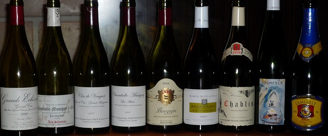 珍しく月曜日にワイン会です。何時も飲み頃のワインをお出ししていますが、今回は新着ワインを飲む会と言う事で07や08のヴィンテージを飲みました。何時ものメンバーと、遠方からご夫婦でお出でになったり、楽天ブログのラ・ロマネさんもお出でになって大変盛り上がりました。ワインのコメントは個々に書きます。泡:ラミアブル キュヴェ メレーヌ ブラン・ド・ノワール 2004 白:フルール・ド・ロテュース 2007 ジョスメイヤー白:ブルゴーニュ シャルドネ 2007 シモン・ビーズ白:シャブリ 2008 ヴァンサン・ドーヴィッサ赤:ブルゴーニュ ルージュ 2004 ユベール・リニエ赤:シャンボール・ミュジニー レザテ 2007 ジャン・タルディ赤:クロ・ド・ヴージョ グラン・モーペルテュイ 2007 ジャン・タルディお食事は4500円の季節のディナーです。