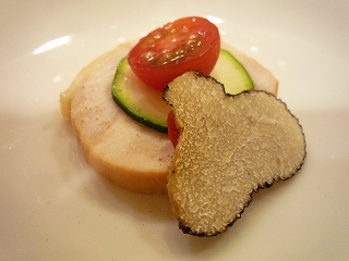 今回は少人数の6人でやる事になったので全品6種ブラインドでやる事にしました。ワインはコート・ド・ニュイの村名当てです。泡:ラミアブル グランクリュ ブリュット赤:ヴォーヌ・ロマネ ヴィヌー 2006 ジャン・タルディ赤:モレ・サン・ドニ 2005 ブリチック赤:ニィイ・サン・ジョルジュ オー・シュイエ 2004 ヴァンサン・レシュノー赤:ジュヴレ・シャンベルタン アン・シャン 2003 フィリップ・ルクレール赤:シャンボール・ミュジニー 2002 ユドロ・ノエラ皆さんのお答えは(*印は最も好きなワイン) 正解AさんBさんCさんDさんEさんシャンパン PN100%シャンパンCH/PN シャンパン CHシャンパン CHクレマンVR:06CM:07VR:06VR:04 *CM:MSD:07 アルロMSD:05MSD:06GC:06CM:01MSDCM:02 マニャンNSG:04NSG:04CM:07 *MSD:06GCGC:04 ロティGC:03GC:04NSG:06NSG:03NSGVR:06 タルディ *CM:02VR:02 *GC:06GC:05VR *NSG:06先ずはシャンパンですが、ピノ100ですが、ブラン・ド・ブランと思う方が2人います。私が何時も言っている事ですが、シャンパンのセパージュは本当に分からないと言う事です。私も当てる自信全くありません。よくシャンパン飲みながらブラン・ド・ブランだか切れが良い、スッキリしているとか、ピノが多いからコクがあるとか、蘊蓄を傾けている方が多いですが、まあ絶対に蘊蓄先生にブラインドで出したら当らないと思います。日本酒でも酵母とか酒米を語っている人多いですが、ブラインドで当てる事は絶対に出来ません。超人は別ですが・・・ブルゴーニュのニュイの村名当ては私も若い頃よくやりました。ブラインドコンクールで入賞した事もありますが、これは意外と面白いです。もう一つはメドックのサンジュリアン、サンテステフ、マルゴー、ポイヤックを当てるゲームです。傾向を見るとジュヴレとニュイ・サン・ジョルジュを間違えた方が多い事です。ある種似た所があるので間違い安いと思います。土臭さと、寸胴の様な太めのボディで見分けるしかないと思います。ヴォーヌとシャンボールを間違えた方も多いです。ヴォーヌの硬質感、シャンボールの果実味の厚みで分けるしかないでしょう。皆さん結構いい線言っています。普段から思い込みと蘊蓄だけで飲まないで、グラスの中のワインに向きあう事です。お食事はアミューズグールのパテとグジェール赤ピーマンのムースと雲丹のゼリー、ジュンサイ添え淡路島産サザエのエスカルゴバター焼き、肝のリゾット添え和牛ランプ肉のグリル サマー・トリュフ添えフロマージュデザート