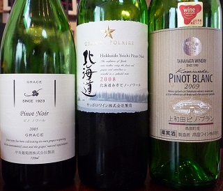 メルシャンの試飲・地下セラー見学・葡萄畑見学が終わって、お約束のランチを取りに勝沼のミルプランタンに行きました。レカンでソムリエをされていた五味さんが始めたお店です。まだオープンして数ヶ月とか・・飲んだワインはワインリストから選びました。輸入ワインが70%、国産ワインが30%位でした。お料理はサラダとスープ、メインは甲州ワインビーフ腿肉のステーキかパエリアでした。私と2人の女性だけがパエリアで後の方は皆さんステーキをお選びになりました。サラダオニオンと舞茸のスープパエリア このパエリアがマダムに不評で・・ちょいとお怒りでした。私も半分残して・・・でした。 ステーキは美味しかった様です。ワインは高畠ワイン上和田ピノ・ブラン2009 720ml上和田ピノ・ブラン 2009 高畠ワイナリー 国産のピノ・ブラン珍しいので頼んでみました。綺麗な切れの良い酸のワインでフレッシュで果実感もあって美味しいワインです。雑味や酒精感も無く、料理に合わせやすいワインだと思います。グラン・ポレール 北海道余市ピノ・ノワール[2008]北海道余市ピノ・ノワール[2008]グラン・ポレール メルローとカベルネを飲んだので国産のピノを2種類注文してみました。同じ余市町の葡萄のワインです。アルザスやドイツのピノの感じですね。甘いベリー香と強めの酸、色も淡く薄めです。タンニンも弱く濃いめのロゼと言った感じでしょうか。販売店資料よりグランポレール 北海道余市ピノ・ノワール年産わずか1382本の限定品!希少な北海道余市産ピノ・ノワール100%!過去10年間でも最高と言われる豊かな日照と低降水量に象徴された素晴らしい作柄。ブルゴーニュのピノ・ノワールやニューワールドのピノ・ノワールとは一線を画す味わい!スミレやイチゴのアロマにかすかにオーク由来のバターやバニラのニュアンス、心地良い酸、柔らかいタンニン、ビロードのような滑らかな余韻。 【ワイン】【10P12oct10】雄大な北海道の自然が育んだ【赤ワイン】グレイス ピノ・ノワールVintage2007 ミディアムボディ750ml ピノ・ノワール 2005 グレースサッポロより酒質も強く、ピノ・ノワールらしいワインです。スミレやベリーの香りに適度な熟成香も出ています。程よいミネラルと綺麗な酸、繊細な果実味、軽めのピノですがバランス良くまとまっています。流石三澤さんのワインだと思いました。木が樹齢を重ねるごとに美味しくなって来るでしょう。今後が楽しみなワインです。販売店資料より中央葡萄酒さんがブドウ栽培適地北海道余市町の名人・木村忠氏にお願いして作っていただいたブドウ(本場フランスに多い垣根方式で栽培)を千歳工場で醸造し木樽熟成したワイン!4年前同様のワイン(余市産ブドウ使用とは書いてありましたが、木村氏の育てたブドウで造られたかは不明)を試飲したときにはやや薄いながらもバランスの取れた味わいでしたが、今ではぐっとボディーが増し、北海道らしい酸味の効いた爽やかなワインです!栽培面積:1ha 樹齢16年樹 0.5ha 樹齢4年樹 0.5haアルコール度数:12% 醸造法:コールドマセレーション有、 タンク発酵、MLF、小樽貯蔵