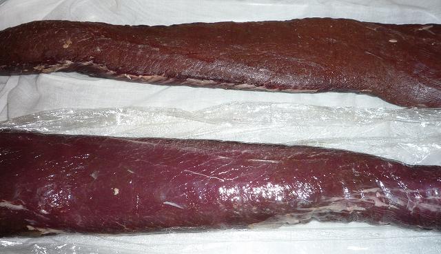 熟成中のエゾ鹿のロース上が熟成10日目下が熟成20日目 光っているのは最後の仕上げにクルミの油を塗って空気に触れないようにしているからです。 完熟して黒光りして来ています。若い熟成前の蝦夷鹿北海道のエゾ鹿猟が解禁され、入荷して来ていますが、通常は何処の店もそのまま切って焼いて出します。でもそれでは本当の美味しい鹿の旨味は出て来ません。11月に入って直ぐに出て来る鹿は熟成していない鹿です。私が好きな鹿は、人里離れた山奥で自然の餌だけを食べて暮らしたオスの4歳以上の鹿を、名人が静かに一発で仕留めた物を、しっかり2週間以上毎日サラシを取り替えて冷蔵庫で熟成させた物です。悪い鹿の肉だと2週間の熟成中に水が出てきて腐ったり、臭くなってしまいます。しかし最高の肉は熟成させると旨味が増して、黒光りして、触るとネットリ手に張り付きます。ジビエを出す店は増えましたが、しっかりと肉を管理し、最高の状態で出す店はとても少ないのです。斉藤シェフはフランスの3星レストランで3年ジビエを扱って来た、経験と拘りと情熱があって、鹿や猪の扱いは最高です。私は外国の輸入品のジビエは扱いません。顔見知りの猟師さんが取った国産の蝦夷鹿、本州鹿、天城の猪、鹿児島の鴨にこだわっています。この鹿は、凄腕猟師、ミートハンターの桑原氏捕獲の個体です。あえて人里離れた場所を選び、的確な捕獲処理をした天然、ホンモノの「エゾ鹿」を半頭買いました。近年知られるようになった「害獣」の「エゾ鹿」ではありません。逃げ回り捕獲された個体は熟成工程をすると、その期間に耐えられず腐敗します。ストレスを与えた事、そして適切な処理をしてない証拠です。次回は本州鹿が入荷します。味の違いをお楽しみ下さい。猟師・桑原氏より、エゾ鹿のステーキ・グランヴェヌール蝦夷鹿の赤ワイン6時間煮込み蝦夷鹿と猪のパテジビエに興味のある方は是非一度ビストロ南で食べてみて下さい。澄んだ味がします。魚は天然物が旨い、河豚でも鯛でも養殖など食べれないと言うグルメの方は多いですが、肉は平気でA5が旨いとか言って食べています。酸化したイワシを食べた養殖魚の脂が不味い様に、酸化したトウモロコシを食べた肉の味も脂が多いだけの人工的に太った肉の塊にすぎません。自然な餌を自分で取って食べる、そして一番美味しい時期に取ったジビエを超える食肉はありません。ジビエは臭いと思っている方も先入観念にすぎません。美味しいジビエの肉とは、澄んだ透明感のある味わいで、滋味があり、脂には香りが、赤身には旨味が凝縮されています。澄んだ淡い味で、沢山食べれてしまうのが特徴です。子供が食べても美味しい!!それが最高のジビエです。