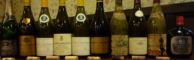 コルトン・シャルルマーニュ 750ml/ドメーヌ・ブシャール・ペール・エ・フィス 1973セラーに残っていたので持って来て開けました。73と言う弱い年ですから駄目だろうと思いましたが、予想通り古酒化していました。残念!!まあ飲めますが、古い野沢菜、タクアン、田舎の古い箪笥の香です。色も琥珀が入った褐色です。ただ味わいに甘い余韻が残るのが救いで食後酒としてなら楽しめます。特級ですから、古くなっても何か良い所が残る物ですね。数人のお客さんは気に入ってくれた様です。ワインは好みなのだと本当に思いました。