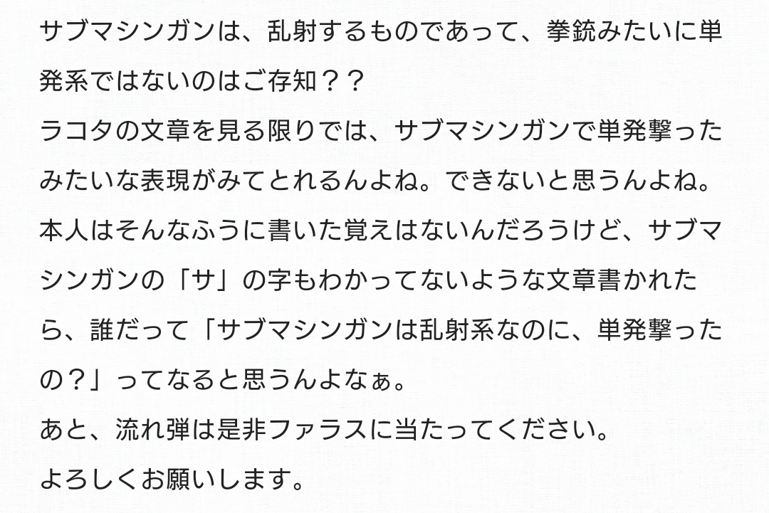 ざっくり纏めると、ラコタは 「サブマシンガン」の性能を1ミリたりとも理解してねーってことだ。