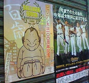 新幹線の人身事故の発生というハプニングで、書けてなかった大阪滞在時の風景をもう少し。新世界にあるジャンジャン横丁で見つけたポスター。ビリケンさんの100年を祝うポスターの横にオリックスの決意ポスターが並んでいるのが可笑しくて思わず写真に収めた1枚。オリックスのローズがビリケンさんをベンチに置いて願掛けをしていた事を思い出したが、今も京セラドームのベンチにビリケンさんはいるのだろうか。一昨日はそのローズの活躍と、近鉄バファローズ最後の勝利投手の山本省吾が完封勝利を挙げた。オリックスで近鉄出身の投手の話題がほとんど無かった中、省吾の好投は本当に嬉しいニュースだし、梨田監督も自分が獲った選手の活躍に相手ベンチでも心の底で少しは喜んでくれていたはず。昨日はダルビッシュについに黒星をつけるかと思いきや、見事にいてまわれてオリックスはサヨナラ負け。今季、ポスターの文句通りに溜息を大歓声に変える事ができるだろうか。梨田監督といえば、大阪のテレビでCM出演している事に驚いた。♪京橋はええとこだっせ、グランシャトーがおまっせ大阪人なら誰でも?歌える京橋のグランシャトーのコマソン。今回何年ぶりかにこのグランシャトーのコマソンを聞いたが、そのグランシャトーのCMになんと梨田監督が出演している。いかにもお金がかかっていないといったCMだったが、ダンディーさと三枚目の2面を見せる梨田監督の迫真の演技(笑)。このCMは北海道では絶対流せないだろう。梨田さんもよりによってなんでグランシャトーのCMに出ているのか(笑)。このCMは北海道日本ハムの監督になる前からオンエアされているのだろうか?梨田監督とオカマの共演(爆)。大阪へお越しの際は、北海道日本ハムのファンの皆さんにこのCMをぜひ見ていただきたいもんだ(笑)。話は横道にそれたが、ジャンジャン横丁。将棋クラブや昔ながらのゲームセンターなど、変わらぬ雰囲気は残っていたが、串カツ屋の盛況ぶりと横丁を歩く人々の質が変わっている事に新世界同様驚かされた。昔訪れた時にはジャンジャン横丁に若いカップルが普通に歩いている風景なんて到底考えられなかった。今回時間が無くて串カツ屋に行けなかったが、次回機会があれば、二度漬け禁止のルールを守り(笑)、串カツ屋の雰囲気を味わってみたい。