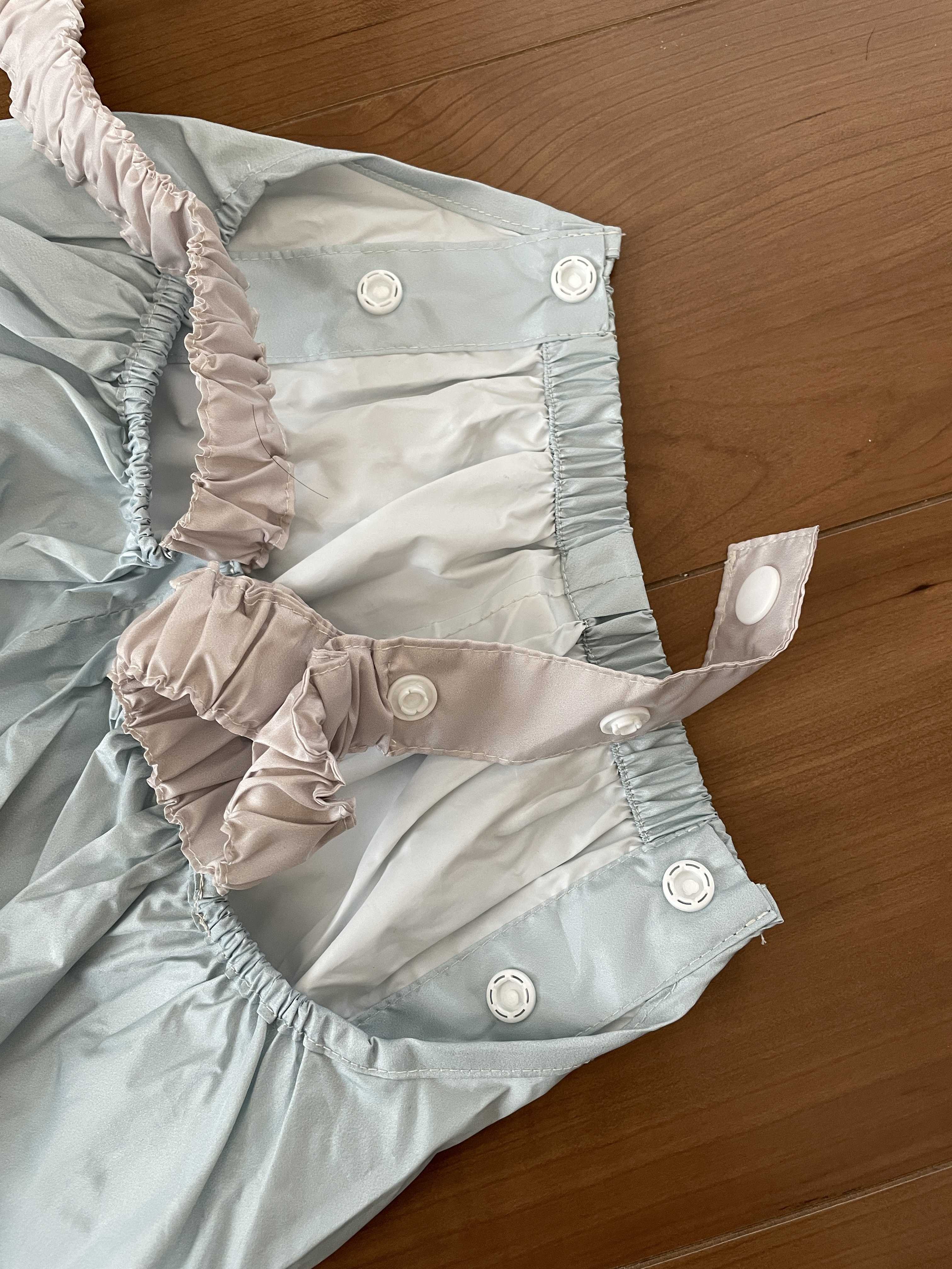 肩のサスペンダーの部分が3段階のプラスチックボタンになっている&フリーサイズで結構大き目なので、しばらくの間(破れない限り)は活躍してくれそうです!