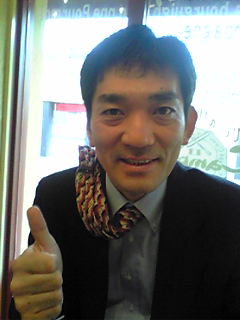 今日、山口県域のテレビラジオなどで活躍するローカルタレントの、大谷ヤスベェさんこと大谷泰彦さんが、急きょ、岩国に仕事で来ているとの、連絡をしてくれ、川西のカンパーニュでしばしお喋りした。>大谷ヤスベェさんとはこの方一昨年、岩国ライオンズクラブ主催の市民文化講座の講演をしに岩国に来られた時に、花束を届けた以来だわ。実に、久しぶりだな~。余談だが、ヤスベェさんに、白木さんは、お会いする度に若返ってますね~。と、言っていただいた。やっほ~♪相変わらず、パワフルで、元気イッパイ、ガッツポーズのヤスベェさん↓ネクタイが上がっているのは、ちょうど、トイレに行かれた後だからデス。(あは、ボツにする予定だった写真をアップしちゃった!)し~かし、つくづく饒舌な方だわぁ。そのすごさは、この私でも口を挟む余地の無い位!完璧に負けてますな(笑)ヤスベェさんは、テレビ、ラジオなどの仕事の他、私と同様にフリーでブライダル司会をされている事もあり、業界の情報に関する話で、いつも話がとても盛り上がる。このヤスベェさんもブライダルのお仕事が、大好きな情熱家なのだ。ブライダルの話はつきない。ひょんな事から、ヤスベェさんの下関の友人の話になり、その方が、あの昨年末の、下関の素敵な日和庵のオーナーである事を知り、その偶然に驚いた!吉本日海さんと言われる方らしく、ブログも見つけた!>日海塾しかし、それにしても、この吉本日海さんて方は、ニュージーランドにも家を持ち、ロールスロイスやベンツなどの高級車を、何台も持っている、すっごいお金持ちの方らしい。日和庵は、まさに、そんなすごい方が創りあげたお店らしく、セレブの隠れ家という感じだった。改めて食事に行ってみたい気持ちが、ますます募るわぁ~。