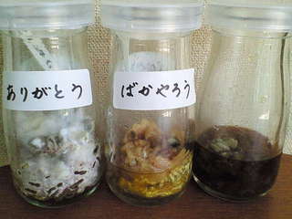 ここ最近、自分を取り巻いている空気に、すごいエネルギーを感じることが多い。昨日の話。さっちゃん:先日、私の友達が開いた大竹のお洒落なカフェ>huitに、白木さんと一緒に行ったでしょ。そしたら、その週、府中とか福山とかの遠方から、たくさんの人がカフェに来店してくれて、すっごく忙しかったんだって!そんな遠方には、まだ広告出してなかったんで、きっと白木さんのブログ効果じゃない?へぇ~。すっごいなぁ~。さっちゃん:白木さんのブログは元気が出るブログだから、ファンが多いと思うよ♪きゃ~♪さっちゃん♪そ~んな、嬉しいコトを…。アタクシは、嬉しくて、羽が生えて、飛んでいきますよんっ♪今日は今日で、>占いカフェノラのノラままさんから、ノラまま:すっごい遠方からHPを見たと言って、占いのご依頼があったよ!と、言ってくれたし…。も~し、それが、本当に、このブログ効果なのなら、みなさまっ!こ~んな、拙文、稚文だらけの私のブログのご愛顧を、本当に、ありがとうございます。m(_ _)m心から、感謝申し上げます。自分の身近な人や周囲の人を喜ばすと、それが喜びのプラスのエネルギーとなって、自分を取り巻いてくれるらしい。ここ最近、そのプラスの波動のエネルギーを、毎日の様に強く感じる日々だわ。余談だが、リンパセラピー「ルート」のカヨちゃんも、グレース・アイコ営業を、ガ~ンガン絶好調に頑張ってくれてるし、>さんかん美さんのブログじゃないが、ここ最近、自分自身が思った以上に、すべてのことがうまく行っている。ふと、どうしてなのかな?と考えてみてもわからない。特別人よりたくさん努力をしているわけでも無いし、単に、ツイてるだけだと思う…。でも実は、このツキは、たぶんプラスの言霊がもたらす、波動のエネルギーのお蔭なのかなぁ~?ここで、ま~たまた登場!さんかん美さんによる言霊実験↓↓同じ釜で炊いたご飯を、それぞれ同一条件のビンに、同じグラム数を計って入れ、それぞれのビンに、「ありがとう」、「ばかやろう」、という言葉をかけたり、「無視」したりしたものの結果。(実施後6ヶ月の写真)「ありがとう」のビンのご飯は、腐らずに発酵「ばかやろう」のビンのご飯は、腐敗「無視」のビンのご飯は、激し~く腐敗この実験の結果を信じる信じないは、人それぞれだけど、言霊の力があるものなら、それを、上手く利用してしまった方が、絶対にお得。なぜなら、言葉に発するのに要する、(口を動かす、声帯を振るわせるなど)物理的なエネルギーは一緒なのだから…。
