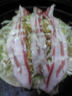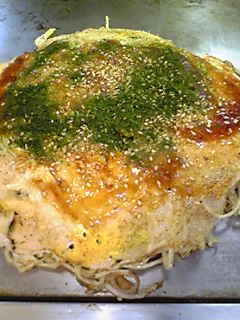 今日は、我が家のお好み焼き初め♪家で、ホットプレートで焼く時、いつも、不便に思うのが、ヘラ!ステンレスのヘラでは、ホットプレートを傷つけてしまうし、耐熱プラスチック製のは、先の幅が小さい!ホームセンターで、もっと大きいのを探してもらったのだが、メーカーも作って無いらしい。特に広島風のお好み焼きは、ヘラが大きくないと、具材をひっくり返す時に、中身がバラけやすくて不便なので、せめて広島地域限定でも、ホットプレート用の大ヘラを作って欲しいなー。ヘラの不便さを感じながらも、やっぱり、ホットプレートで焼くのも、広島風が好きだなー。本場の広島風のごとく、まず生地を薄く円形に伸ばし、キャベツ、もやし、イカ天、肉を重ねて…↓ひっくり反してしばらくおく。そばは、山口県では、ゆがいて使う生めんは売ってないので、とりあえず、袋めんに下味をつけて炒めておく。その時、良く焼けた肉のカリ感とそばのカリ感を出すために、並べてそのまましばらくおく。そして、ここからが、私の一工夫。最後に貼り付ける玉子を壊さず、黄身の半熟感を出すため、そばの中を広げて、そこを通して玉子を割り入れ、黄身を崩さないよう、そばを玉子の上に重ねる。この時、黄身の上へ重ねるそばは厚みを少なめにしておく。↓こうすると、黄身が壊れず半熟になる。そして、その上に、重ねた野菜や肉の具材を乗せて、ひっくり返し、ソースを塗り、青海苔などを振りかけて、出来上がり!↓黄身が半熟なのが、わーかるっかな~???でも、やっぱり、鉄板で焼いたお好み焼きには、ど~しても、敵わないのが、ぐやじーなー。