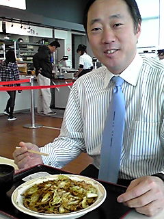 岩国市役所の食堂で、岩国市長の福田さんに出会った!↓早速斜め前に座って、パチリ!うーん。しかし、市長の焼きそばの具が、普段のモノより多い気がするのは気のせい?福田市長は、目の前の私の隣に座っている男性と、真剣に、岩国の市政についてのお話をなさりながら、焼きそばを召し上がっていらっしゃりましたデスヨ。米軍基地の問題が云々・・・お2人の話が、一段落した風なところで、いきなり、私が口を挟んだ。私:私、ベリーダンス始めたんですよぉぉぉ~~~っ!!!(いきなり、その話題ですかっ!)福田市長:はぁ。(多分、頭の中?マークでいっぱい)適当に返事をくれた後で、市長は、またまた引き続いて、前の男性と真剣に、岩国の市政問題について云々・・・また、話が一段落した風なところで、ま~た私が口を挟んだ。私:私、夜のお店でダンサーデビューしますからねぇぇぇ~~~っ!!!(岩国市民全員に告げる気ですか!)福田市長:えぇ?(市長の血液型はAB型だが、こーゆー場合は、急に頭のスイッチは切り替わり難いとみた)それから、また、真剣な2人の話の合間をぬって、私:コレ見てやってくださぁぁぁいっ!!!(前の、あの赤い衣装の写真を見せた。そ。あの例の写真だ。)とか~、私:ダンサーデビューの時は、見に来てくださぁぁぁ~い!!!とか~、もう止まりませ~ん!福田市長:はぁ。(たぶん、どんなリアクションしたら良いのかわからな~い。)でもでも、一応、気を使ってくれたのか、発表会の時は、教えてくださいね。と、仰ってくださりましたデスヨ。市長さんも、色んな人に気を使わなくっちゃいけなくって、たーいへんね~。友達のTちゃんに、Tちゃん:そーゆー行動のことを、KYじゃなくてAKYって言うんだよ。と、言われた。私:AKYって?Tちゃん:空気読めない(KY)じゃなくってぇ~、あえて空気読まない(AKY)。あっは~!!!すんばらしぃ~!!!大変、勉強になりました。ありがとうございます。