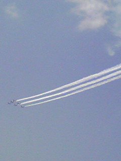 ブルーインパルス!朝一番のお客様の、リンパのお手入れを済ませて、司会者仲間のさっちゃんと一緒に、山口県防府基地の航空ショーにJRで向かった。岩国駅の上空は雲が多かったが、電車で防府駅に向かうにつれ、だんだんと晴れ間が広がった。さっすが、スーパー晴れ女様だわぁ♪先日の5月5日、岩国基地フレンドシップデーでのショーを見損ねた私は、本当に、心わくわく踊る思いだ。防府基地入り口近くに到着した時間ギリギリで、フライトショーが始まった。ダイヤモンドテイクオフパーティカルキューピットさくらその他、フォーシップインパート、レインフォール(プログラム名は学習済み)などなど、色々なプログラムがあったが、2人でキャーキャー言ってる間に、写真のタイミングを、見事にはずしてしまった。だって、あのカッコイイ井川さんが、乗ってるんだもんっ♪知ってる人が乗ってると思うと、よりいっそうエキサイティングだわぁ~♪共に司会業をやっている者同士なので、2人の声は、とっても大きい。周囲の目をついつい集めてしまった。しっかし、T-4の白と青の機体は、ホントに感激の美しさだ。太陽の光を浴びて、旋回しながらキラキラと輝いている姿は、まさに蒼い衝撃だ。2人とも、大空で自由自在に展開される、まるでドルフィンの曲芸のような匠の技に興奮し、感激で胸がいっぱいになった。熱烈な追っかけ航空ファンが、全国にたくさんいるのも、わかるなぁ~♪カメラを片手に、ブルーインパルスの、オリジナル帽子を被っているファンもいた。ブルーインパルスは年間20回位、各地で行われているが、秋には、北九州でも行われる予定。ぜひ、また見に行きたい~♪↑(ついに、追っかけ組参入か!?)>ブルーインパルス