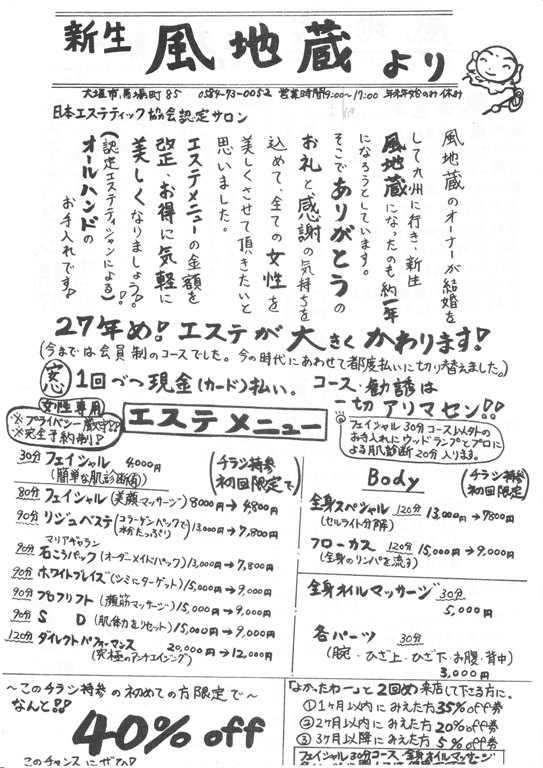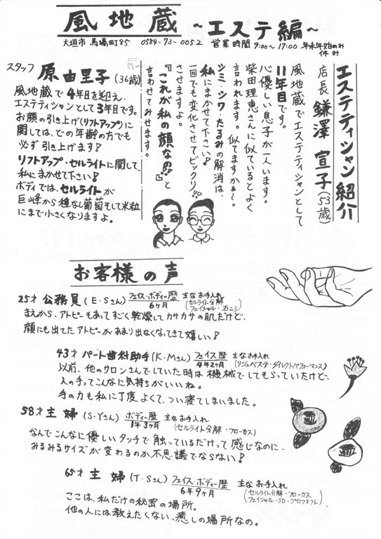 ずいぶん遅ればせながら風地蔵の お正月の様子です~。写真を 送ってもらっていたのに気がつきませんでした~~ヽ(^。^)ノあわててHPに載せてもらうようにお願いをしてブログも書こうと思います。まずは 毎年恒例 スタッフの お着物姿~。若い順で。。笑原 由里子自己紹介 風地蔵で4年目を迎え、エステティシャンとして3年目です。お顔の引き上げ リフトアップに関してはどの年齢の方でも必ず引き上げます。リフトアップ、セルライトに関しては 私に任せて下さい!ボディーでは セルライトが 巨峰から 種なし葡萄 そして米粒にまで小さくなりますよ(*^。^*)大橋さん~風地蔵歴は 一番短いけれどなくてはならない人材です。おちついて、あたたかく 風地蔵とサロン全体の頼れるお姉さんですヽ(^。^)ノ店長鎌澤 宣子風地蔵で エステティシャンとして 11年目です。旦那と 心やさしい息子が 一人います。柴田理恵さんに よく似てると言われます。似てますかあ~。シミ・シワ・タルミの解消は 私に任せて下さい!1回でも変化させてびっくりさせますよ!「これが私の顔なの!」と言わせてみせます。こんな感じで 1年がとっくにスタートしましてもう 2月のイベントひなまつり展 真っ最中ですヽ(^。^)ノ風地蔵の玄関にはあたしが貼って行った 結婚式の写真に原先生がコメント書いてくれてました~。うっふっふ~~ヽ(^。^)ノ風地蔵ともどもよろしくお願いいたします~~(*^。^*) 岐阜県 大垣市 馬場町85(奥の細道むすびの地 西) 風地蔵 AM9:00~ PA5:00 0584-73-0052わたしの感動撮ってます。 愛のクリックお願いします。 ↓ ↓写真はこちら http://rion5230.blog43.fc2.com/自分らしさを求めて。。ランキングに参加してます。日に一度クリックしてもらえるとうれしいです。 ↓ ↓ ↓にほんブログ村