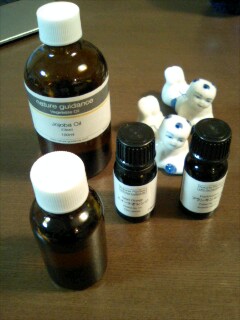 金曜日には浅草橋に行ってきました。母と待ち合わせてまずプリンセストラヤのファミリーセールに、その後浅草橋で買い物し、日暮里にも行く予定になっていましたがセールと浅草橋の買い物が終わった時点で完全に力尽きておりました・・・予想以上に体力が落ちているらしい。日暮里は次回ということに。浅草橋では最近よく寄るビーズショップj4さんでまたいい買い物ができました。アクリルビーズが豊富で行くたびにいつも面白い発見があります。天然石ものとは違った面白いアクセサリーが作れますヨ。さて、写真は妊娠線予防用に作ったマッサージオイルです。妊娠中は使えないエッセンシャルオイルも多いですが色々調べてオイルを作りました。ベースとなるキャリアオイルはホホバオイル30ML。エッセンシャルオイル(精油)はグレープフルーツ3滴、オレンジスイート2滴、フランキンセンス1滴。グレープフルーツはむくみ取り、オレンジスイートは整腸作用、フランキンセンスは肌の若返り効果があるそうです。よく混ぜてから遮光瓶にいれ一週間ほどで使い切らないといけません。使う時はオイルを手に取り手のひらをを合わせて暖めてからお腹や太ももをマッサージしています。30MLは一週間で使うには結構多いのでふくらはぎのマッサージにも使っています。マッサージをすると柑橘のフレッシュな香りでいい気分♪肌はしっとりになりました。ベースのオイルはスイートアーモンドが肌の柔軟性を高める効果があるようなので今度はホホバと両方混ぜて使ってみようと思います。どれくらい効果があるかは分かりませんが、ふくらはぎマッサージは冷えに効いているようなので続けてみたいと思います♪