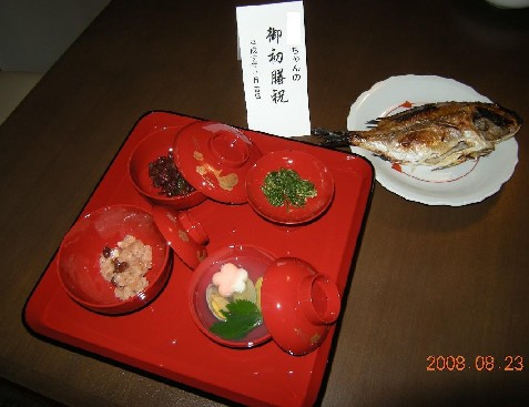 6ヶ月目前にして超遅めのお食い初めをしました。お食い初めは初離乳食にあわせて行いました。メニューは赤飯、アサリのお吸い物、春菊の胡麻和え、かぼちゃと小豆のいとこ煮、鯛の尾頭付き。お赤飯、かぼちゃの煮物は義理母が持ってきてくれました。ハマグリが店に無かったのでアサリで。お膳セットは旦那の両親からのお祝いで頂いたもの。きちんとやるつもりは無かったのに頂いてしまいすごく嬉しかった!絶対自分たちでは買わないようなものだったので。全部口には入れられなかったけれど食べるまねだけはさせていよいよ初離乳食。10倍粥をすり鉢ですりつぶしたもの。スプーンで口に持っていくとパクっと一口。本当は1さじからだけれど、豪快な食べっぷりに3さじくらいあげてしまった・・・もう随分前から私たちが食べるのを見てはよだれをだらーっとたらして指をしゃぶりながら見ていた彼だったのでやっぱり食べたかったんだね~。う~ん、これから離乳食が楽しみだ!8月27日に6ヶ月になった息子。早かったような遅かったような。でも最近は加速度的に毎日があっという間に過ぎていく!やっぱり4ヶ月越えたあたりから随分楽になってきたな~。8月中は暑くて夜何度も起きて大変だったけれどそれも涼しい富士山に2週間ほど避難していたらなくなって。山から帰ってきたらこちらも涼しくなっていたので夜はまたぐっすり寝るようになりました。昼寝も3、4回して、ミルクもごくごく飲んで体重はすでに9キロ近く!おかげで指は腱鞘炎ぎみ。早くお座りしてくれるといいな~と思う今日この頃です。